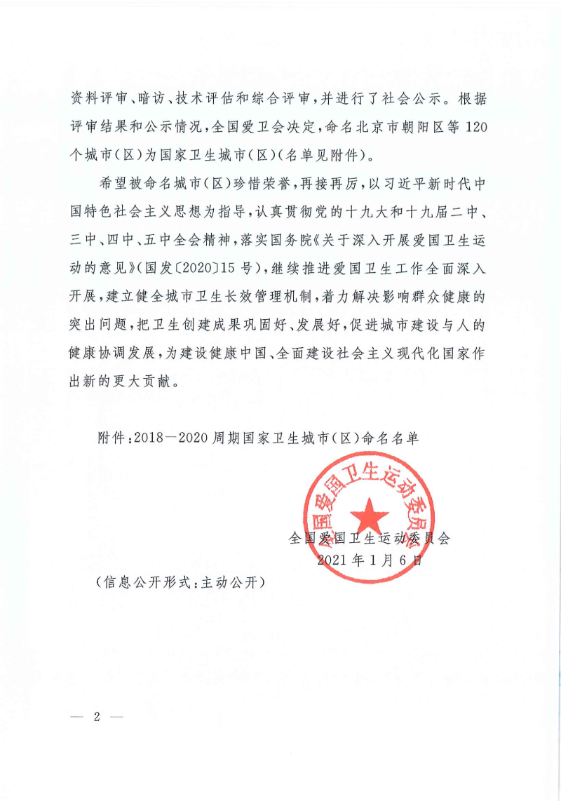 经北京市等29个省(区、市)爱卫会推荐,按照《国家卫生城市评审与管理办法》(全爱卫发〔2015〕4号),全国爱卫办组织专家对2018-2020周期申报创建国家卫生城市(区)的城市(区)进行了资料评审、暗访、技术评估和综合评审,并进行了社会公示。根据评审结果和公示情况,全国爱卫会决定,命名北京市朝阳区等120个城市(区)为国家卫生城市(区)(名单见附件)。