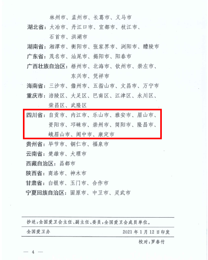 1月14日,记者从国家卫健委官网获悉,近日,全国爱国卫生运动委员会发布《全国爱卫会关于命名2018-2020周期国家卫生城市(区)的决定》,其中四川13地上榜,分别为: