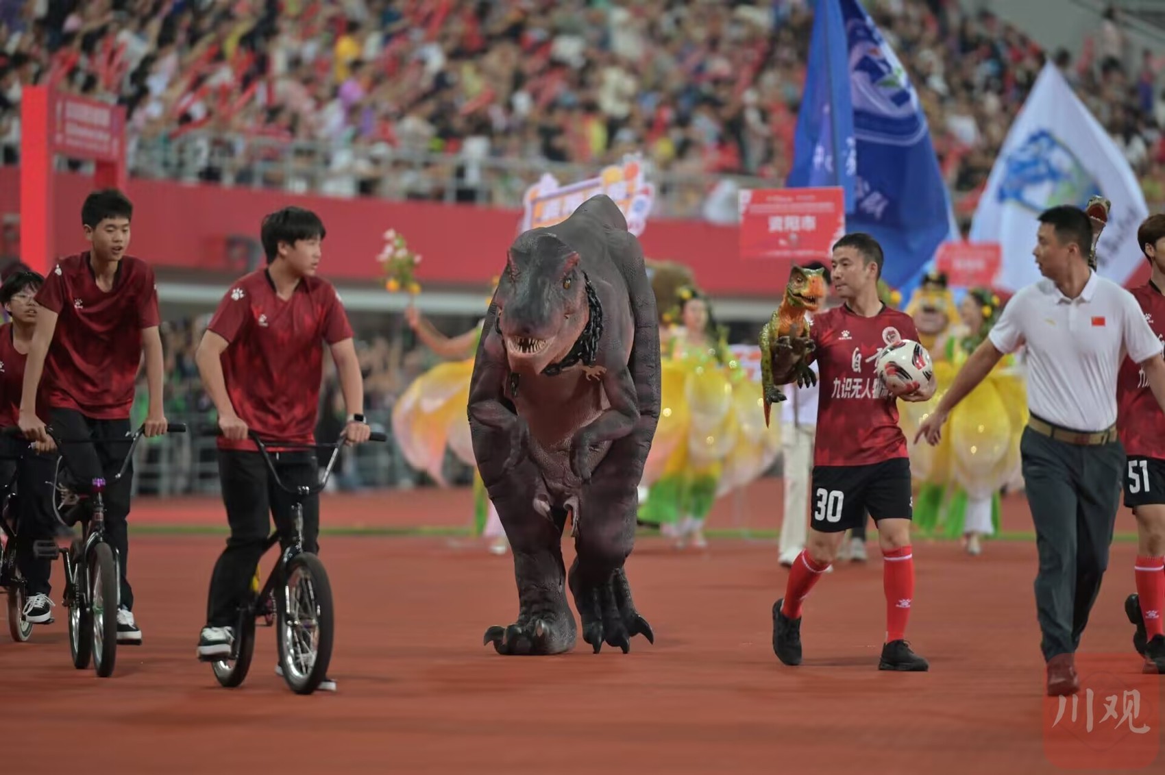 川超开幕式上,21支代表队化身文旅大使,恐龙、大佛、机器狗惊艳亮相,太阳神鸟与桃子龙同场争辉。