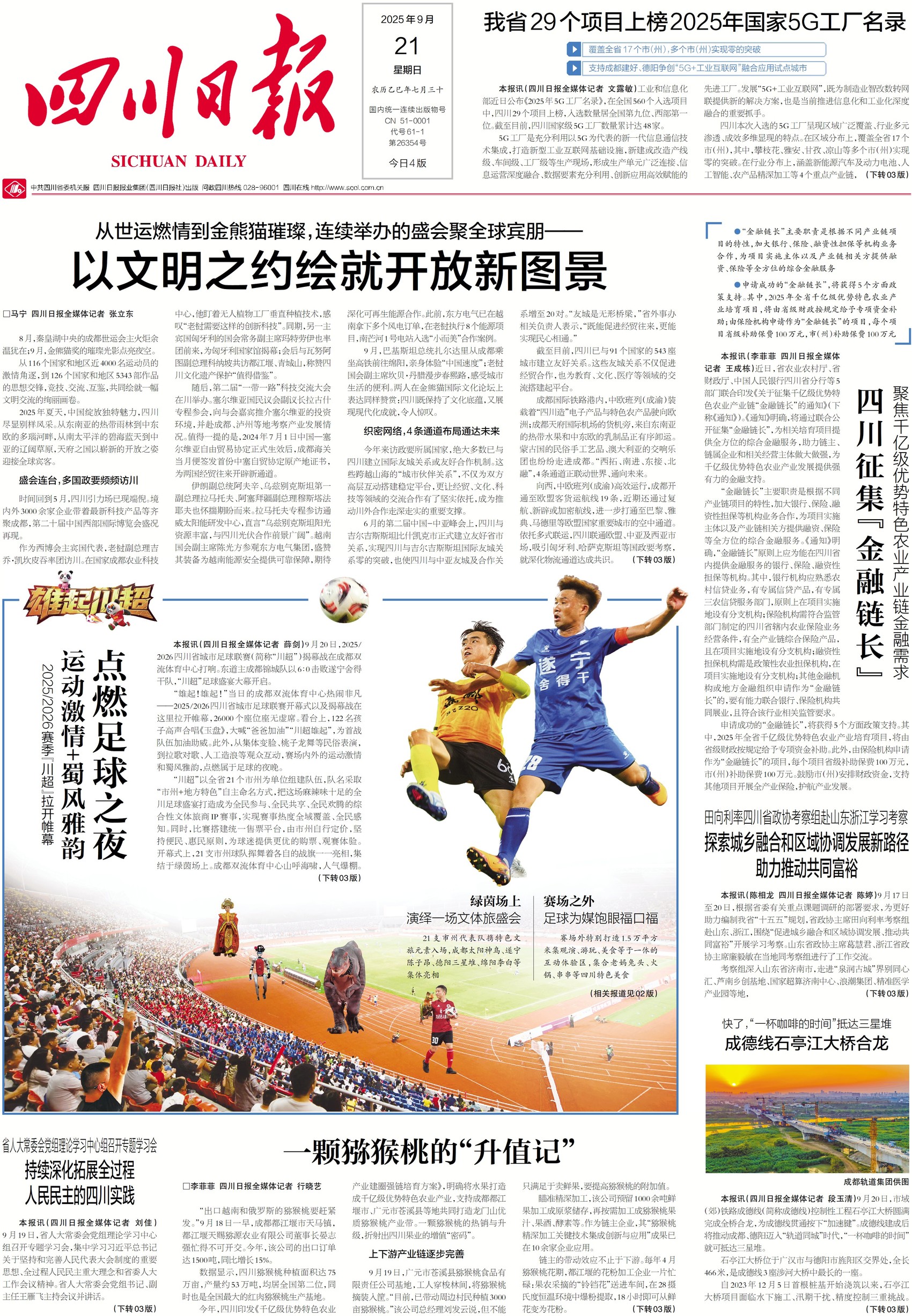 昨晚,“川超”揭幕战在成都双流体育中心打响,在2万多观众齐呼“川超雄起”的火热氛围中,21支市州代表队在“超哥”“超妹”引领下依次亮相。火热较量也“足”够精彩,东道主成都锦城队以6∶0击败遂宁舍得干队,为球迷们献上一场全场沸腾的揭幕大战。“跟着赛事游成都”、跟着“川超”耍各地……各地文旅纷纷拿出大礼包,邀请全国游客看“川超”、品美食、赏美景、享安逸。“川超”足球盛宴大幕已启,今日一、二版,看赛场内外首秀盛况。