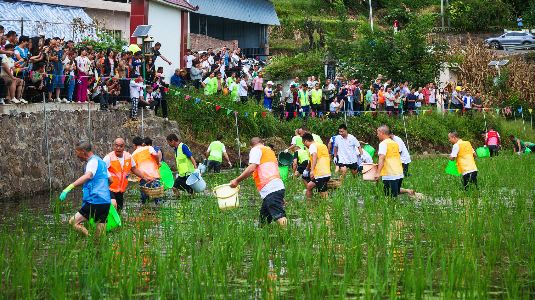 村民在稻田里摸鱼比赛。刘媛摄