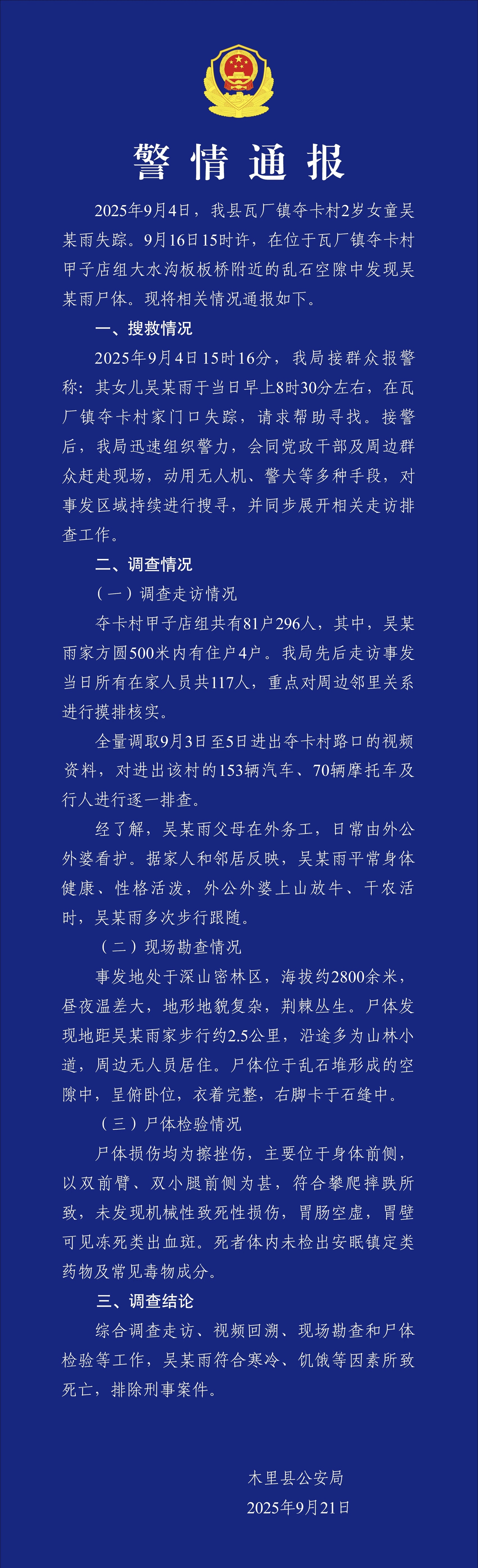9月21日,木里县公安局发布警情通报,具体内容如下。