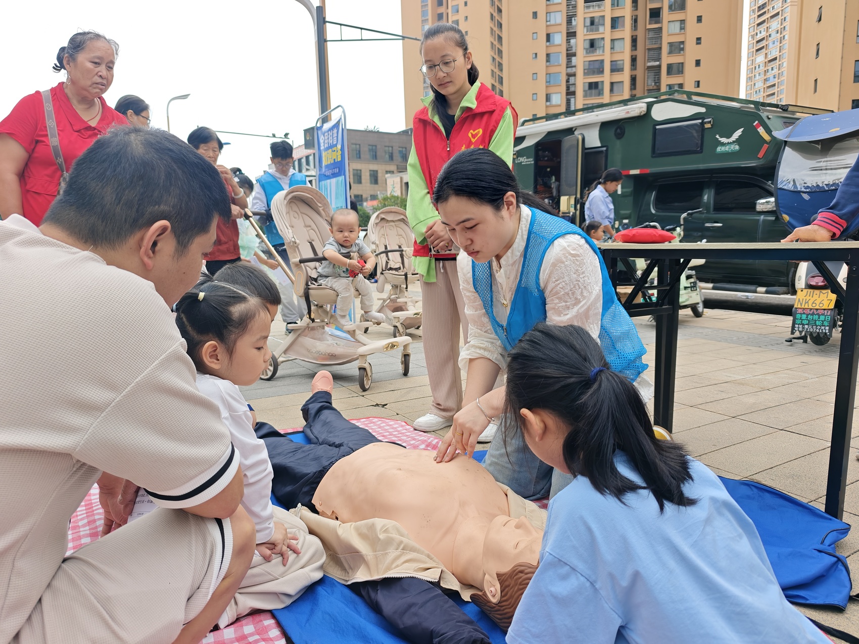 活动现场设置了多个科普互动专区,涵盖科普器材体验、趣味问答、垃圾分类讲解、生活小常识及急救技能普及等项目。居民凭游园券穿梭于各打卡点,在完成互动任务集章的同时,也潜移默化地学习科学知识。整个社区欢声笑语不断,科普氛围浓厚。