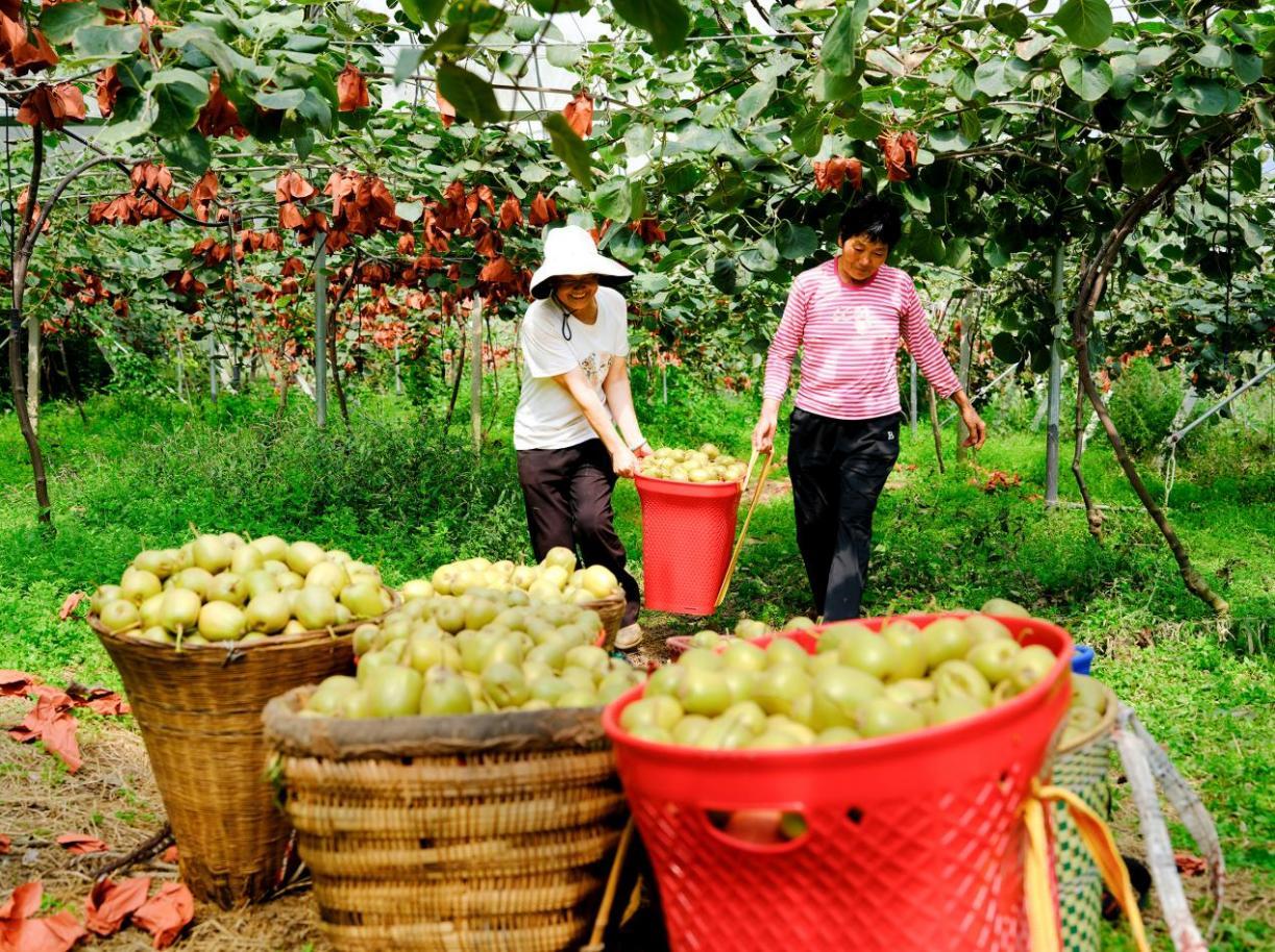 “今年摘了300斤梨子卖了1500块钱,我们还分季节在梨园里套种了小麦、大豆,再加上我就近务工的收入和土地租金,今年全家收入能有6万多块,日子真是越过越好了!”亭子镇长江村村民李正淑笑着说。