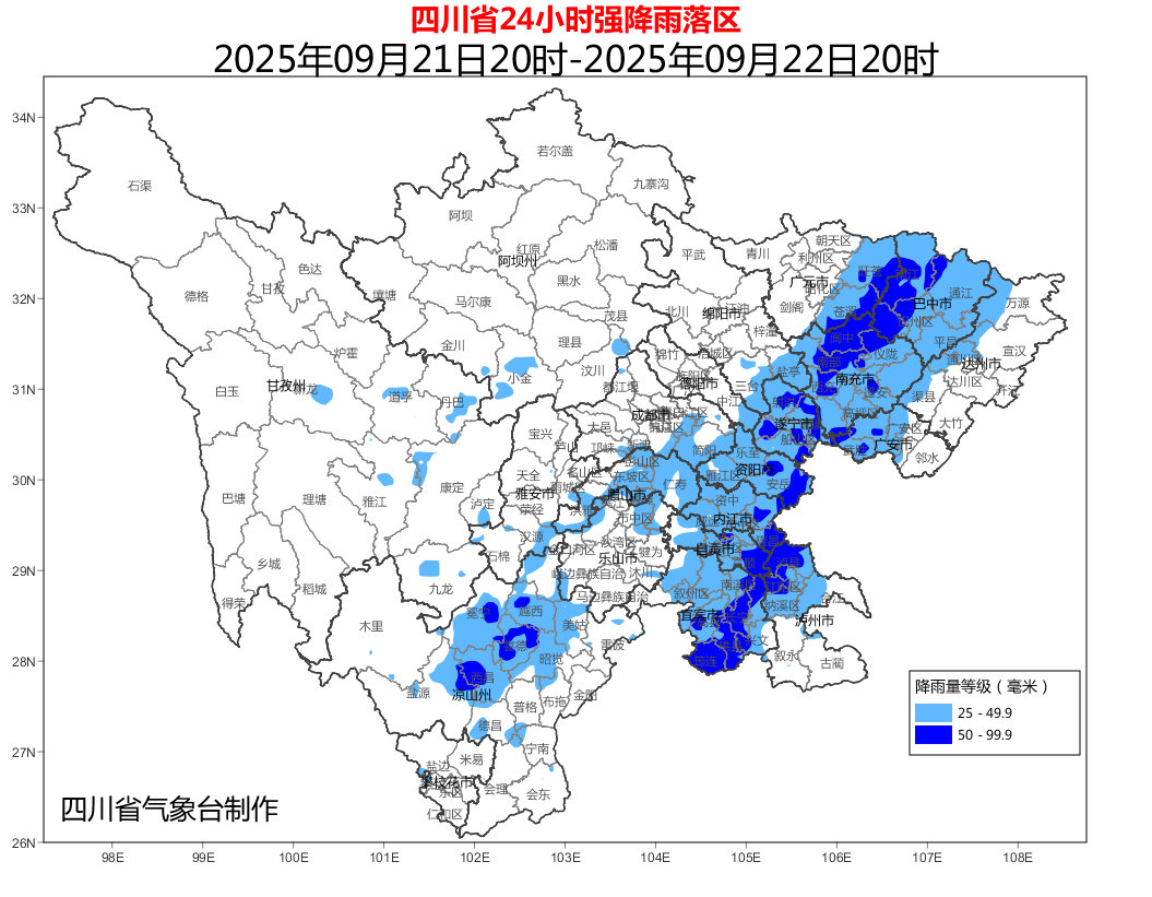 四川省气象台15时40分发布暴雨蓝色预警。9月21日20时到22日20时:巴中、南充、遂宁、资阳、内江、自贡、宜宾、眉山8市,达州、广安2市西部,广元、绵阳、德阳、成都4市东部,泸州、乐山2市北部及凉山州中部北部有大雨到暴雨(雨量40~80毫米),局地大暴雨(雨量100~120毫米),最大小时雨强20~40毫米;冷空气影响时,盆地中部北部有4~6级偏北风,局部可达7级或以上。