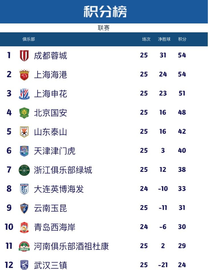 9月21日,2025赛季中国足球超级联赛第25轮比赛迎来两场焦点对决,联赛排名前四名的球队捉对厮杀。虽然上海海港客场3∶2击败北京国安,不过做客上海体育场的成都蓉城凭借周定洋在读秒阶段的进球,1:1战平上海申花,目前以54分继续排名本赛季中超联赛第一。