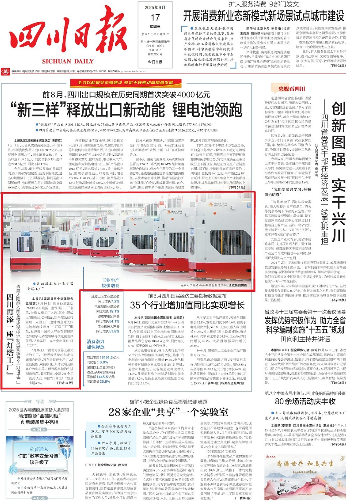 二、头版:全球光伏电池制造领域首个“灯塔工厂”来自眉山