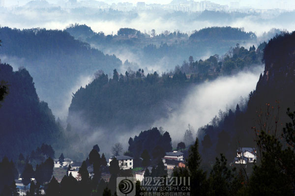 1月2日,巴中市南江县红四乡三清村缥缈云雾绕环山峰,村民的新房在雾中若隐若现,如同动态水墨画。