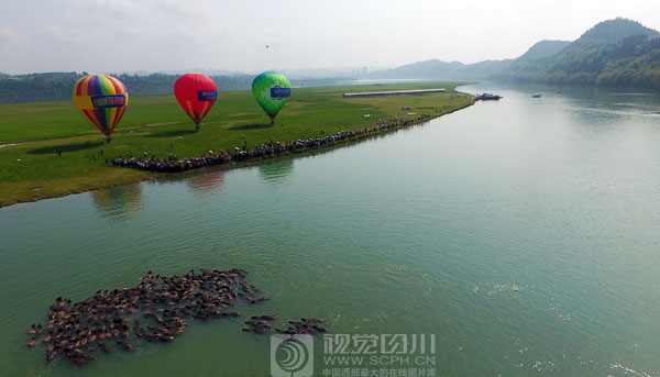 4月28日,蓬安县相如镇油房沟村,近200头水牛组成的水牛大军冲向嘉陵江江中岛。