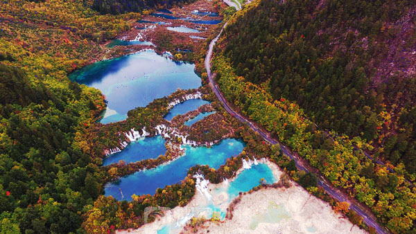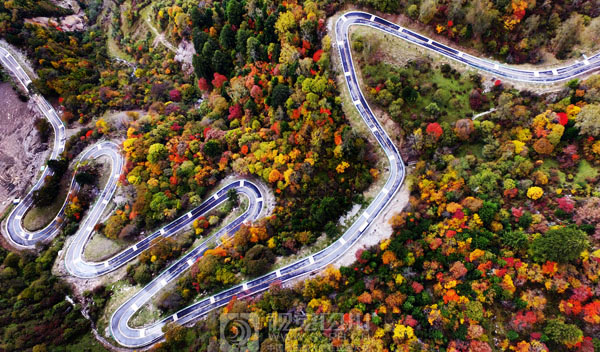 10月30日,九寨沟县勿角乡红叶漫山、山路如飘带。