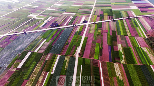 12月10日,南充市嘉陵区河西镇直属村,河西镇万亩蔬菜产业园,一垄垄不同色彩的蔬菜像七彩地毯铺在嘉陵江畔。