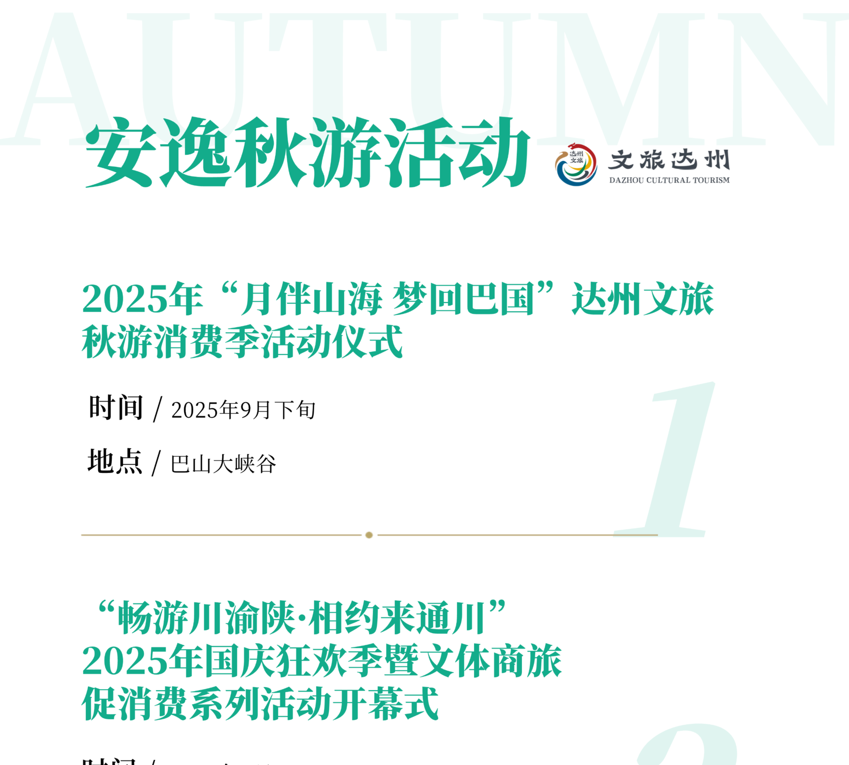 在巴山大峡谷重点举行2025年“月伴山海 梦回巴国”达州文旅秋游消费季启动仪式,发布系列促消费活动、产品、线路和政策等,拉开“秋游达州”序幕。还将举行通川区“畅游川渝陕·相约来通川”2025年国庆狂欢季暨文体商旅促消费活动、达川区2025年“国庆来达 川流不息”主题州河夜游系列活动、八台山国庆八天乐、月亮坪《飞越巴山月,醉瞰双节夜》活动、“荷香庆双节·七天乐不停”莲花世界国庆中秋文旅系列活动等。