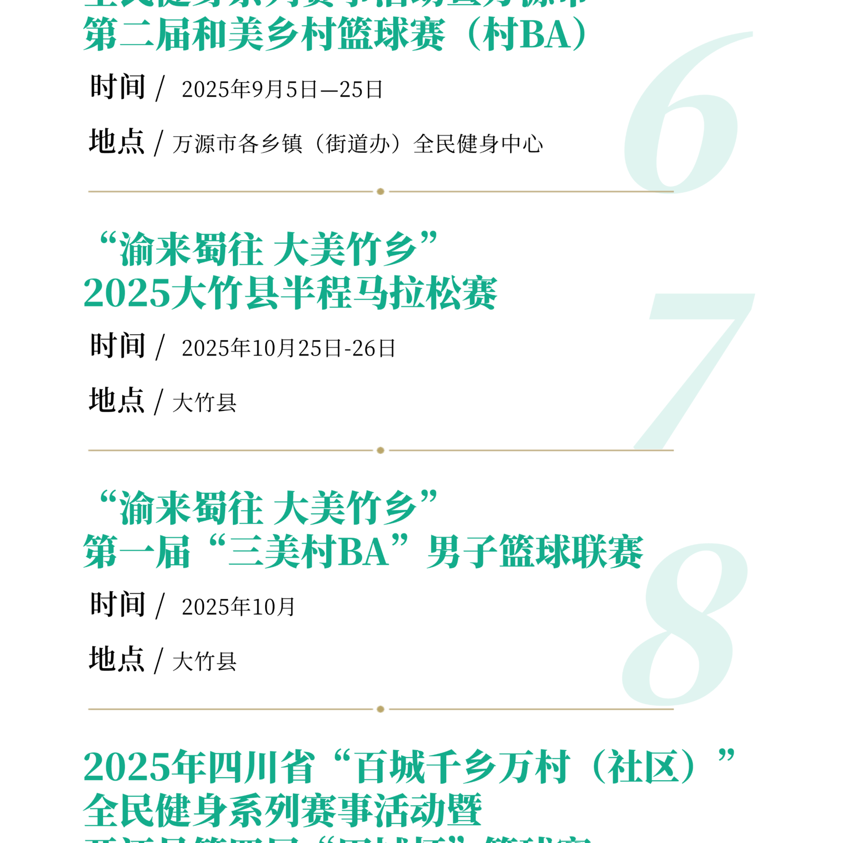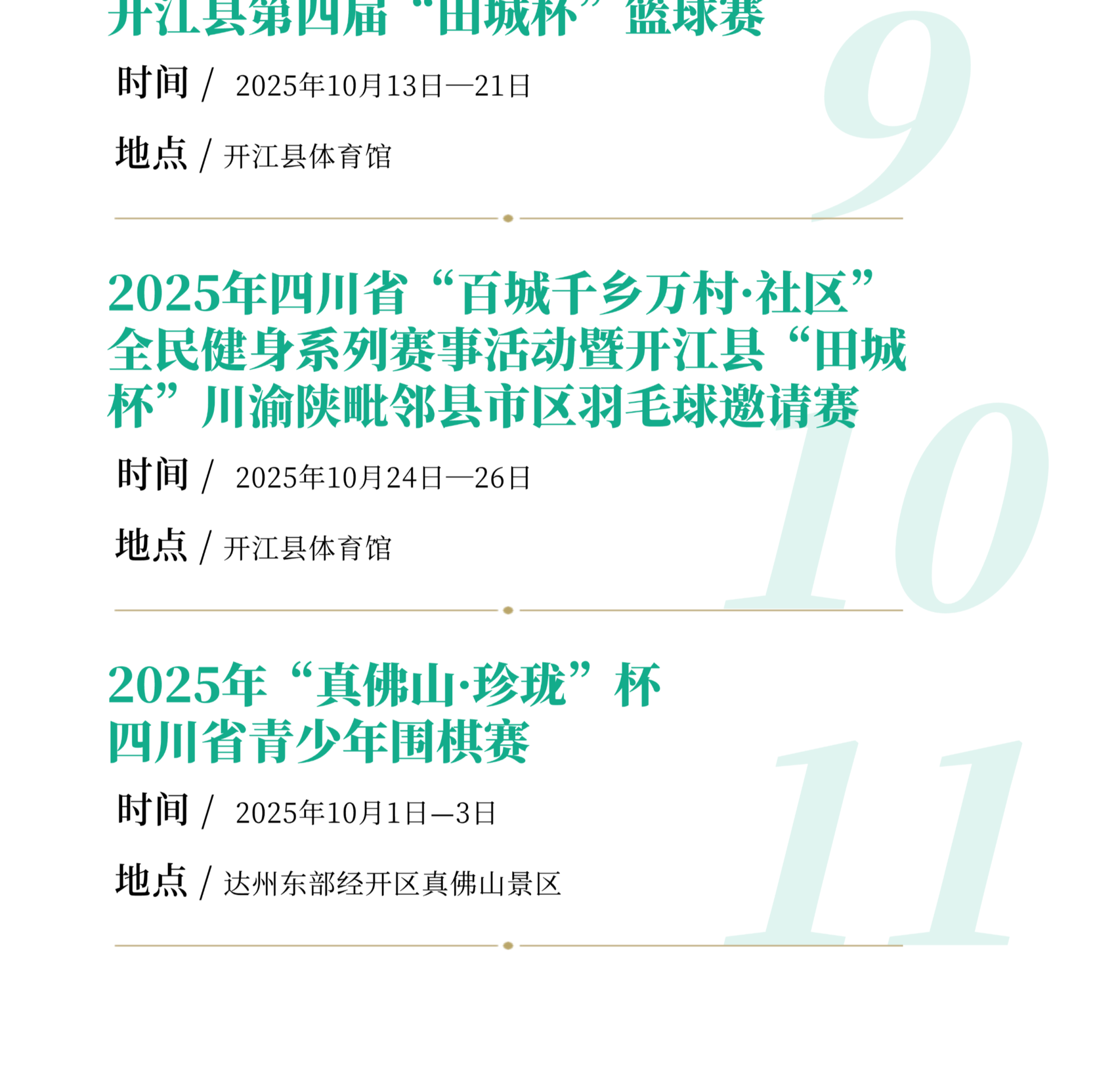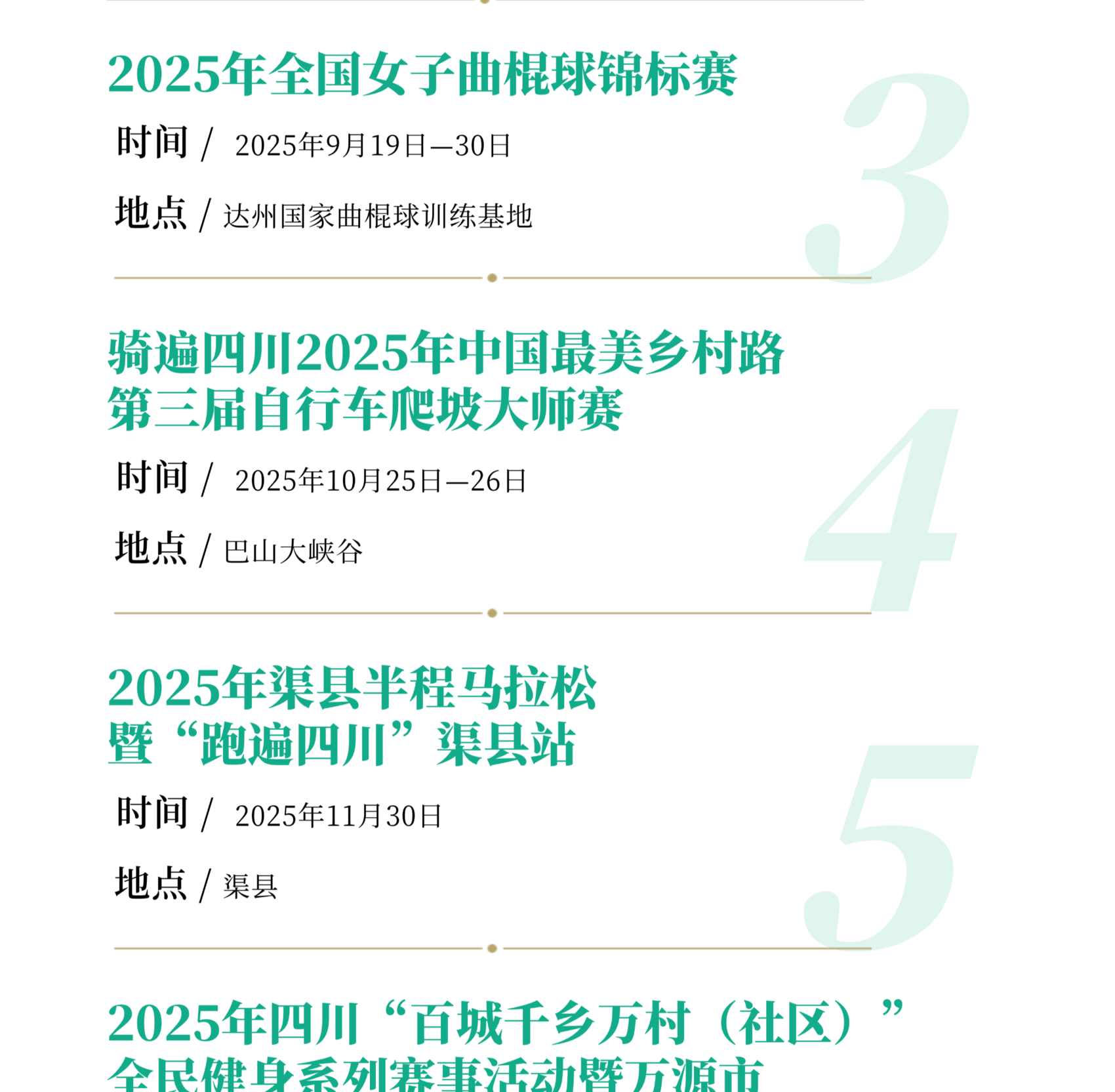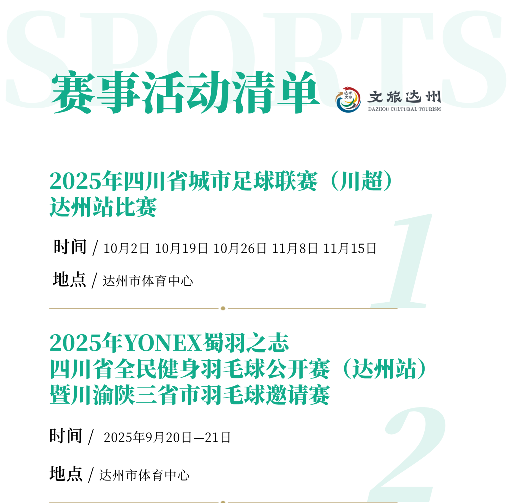 重点举行2025年四川省城市足球联赛“川超”达州站比赛、2025年四川省全民健身羽毛球公开赛(达州站)暨川渝陕三省市羽毛球邀请赛、2025年全国女子曲棍球锦标赛、2025年四川省广场舞大赛、2025年中国最美乡村路巴山大峡谷第三届自行车爬坡大师赛、2025年渠县半程马拉松暨跑遍四川、“渝来蜀往 大美竹乡”2025大竹县半程马拉松赛、达州东部经开区“真佛山·珍珑”杯四川省青少年围棋赛等精品赛事活动。