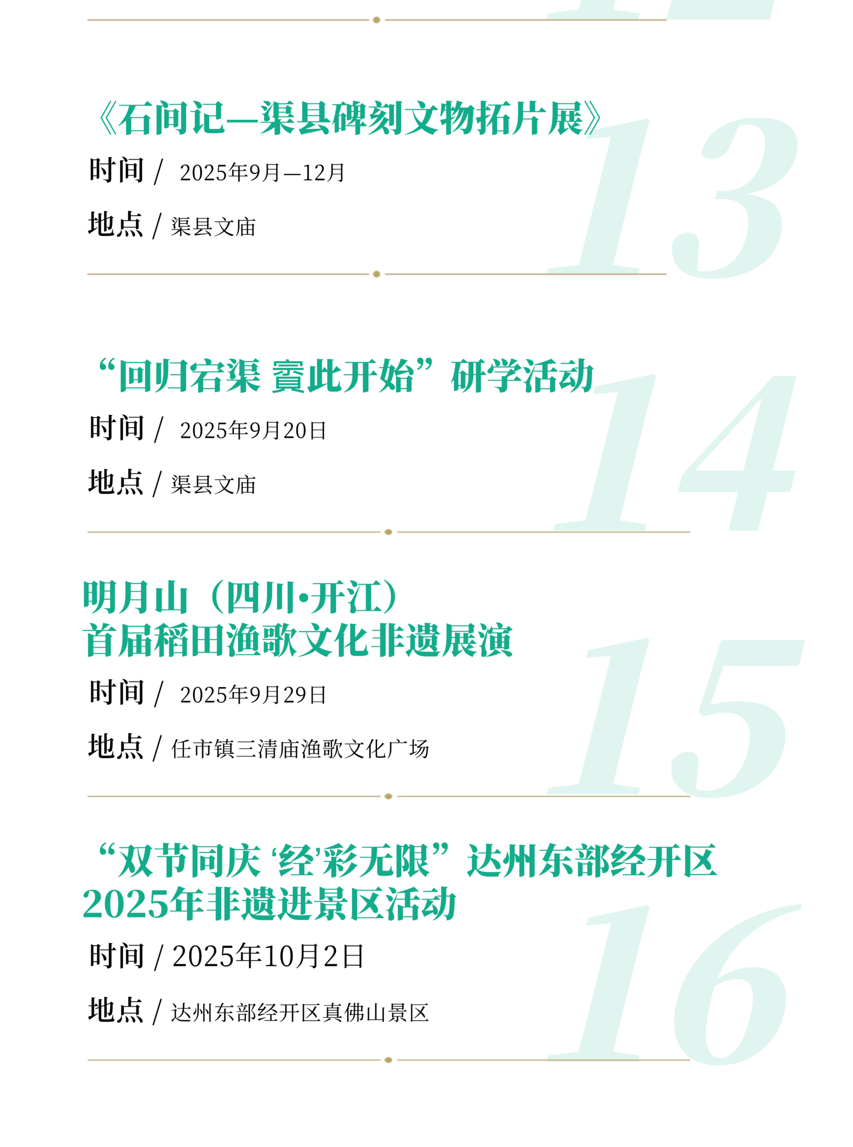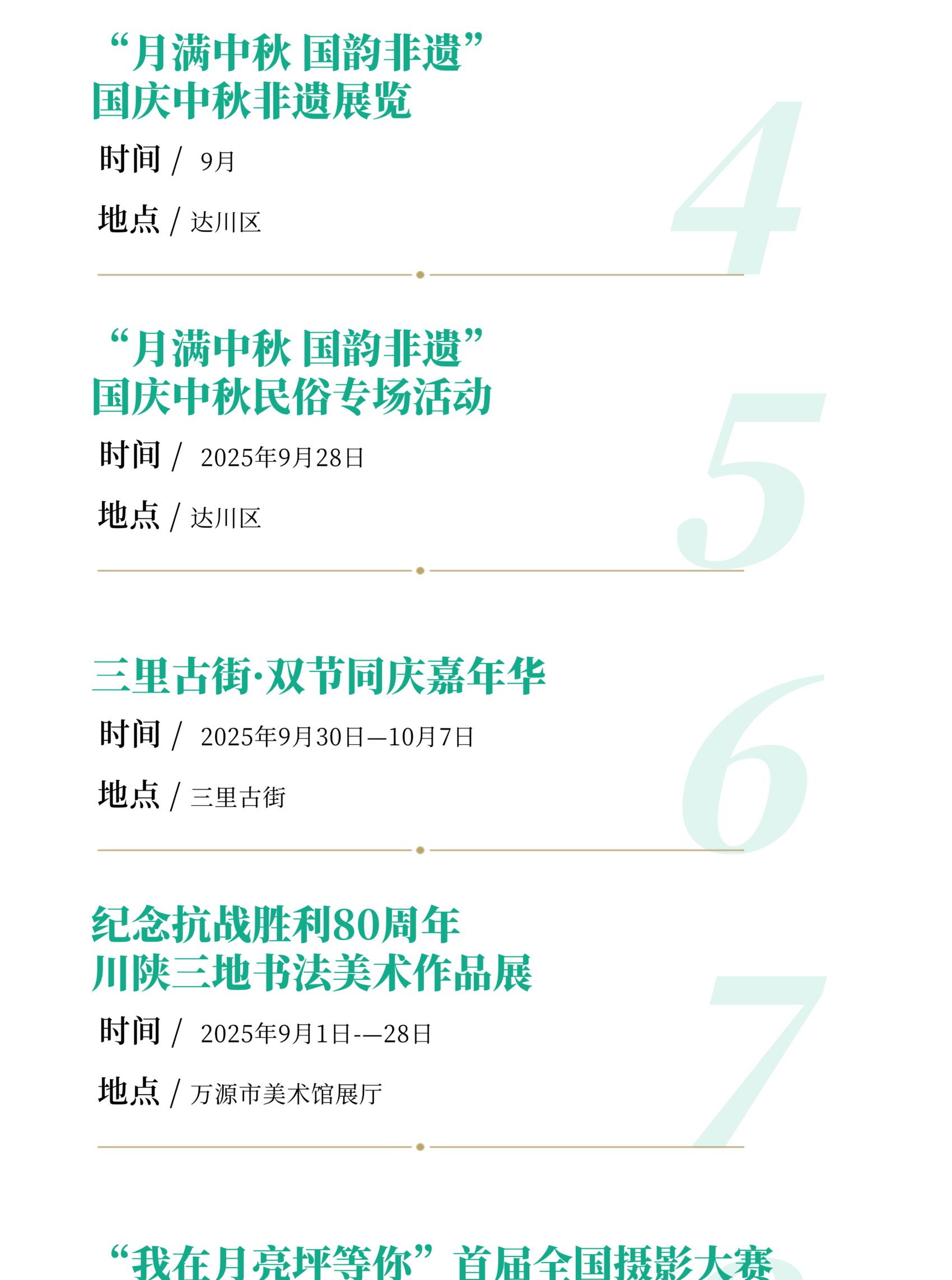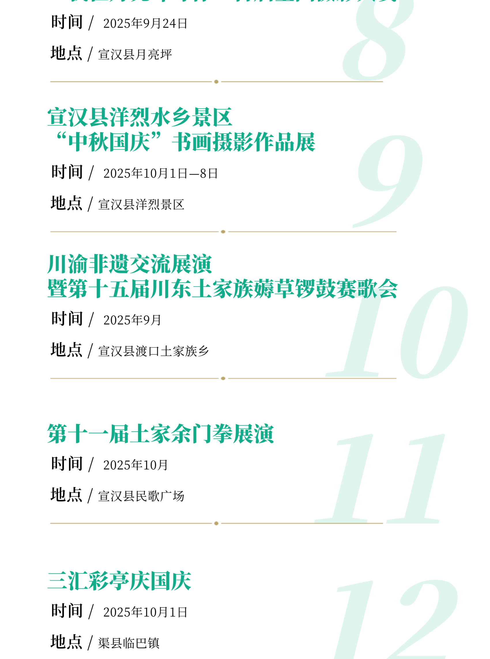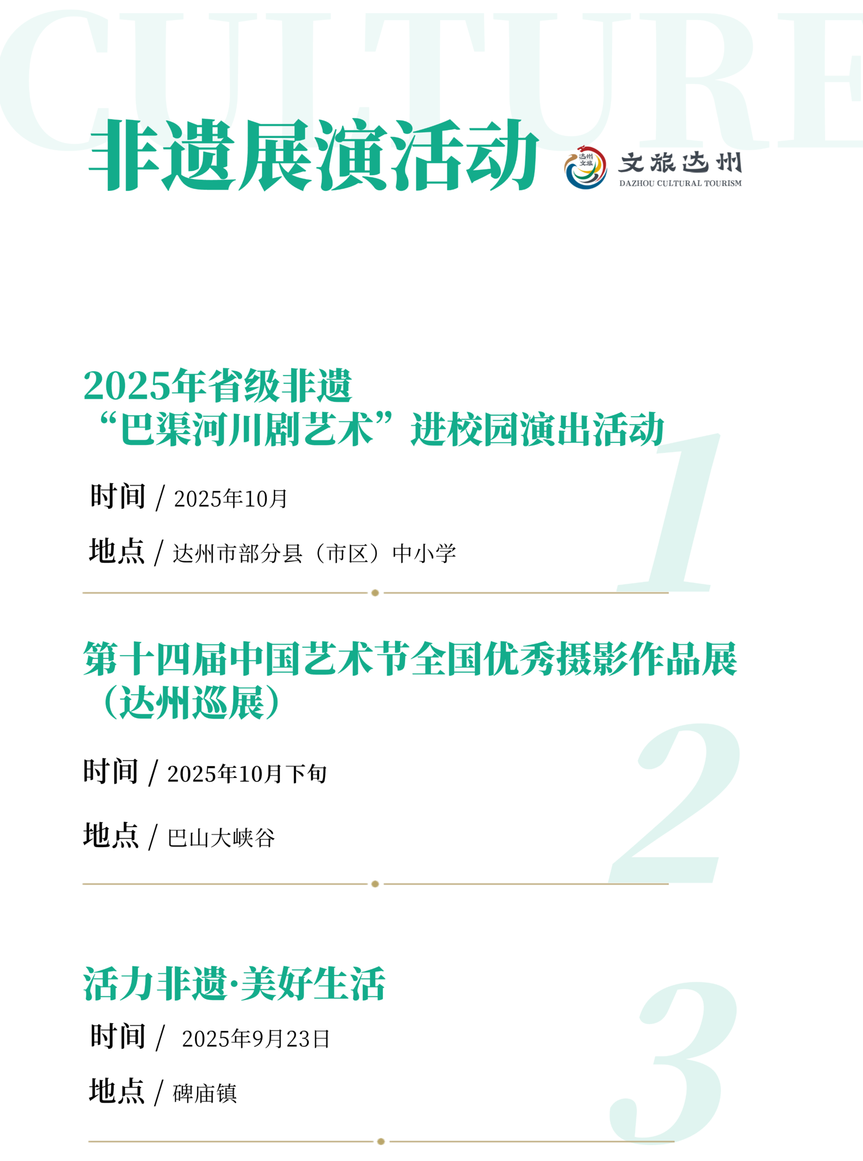 重点举行2025年省级非遗“巴渠河川剧艺术”进校园演出活动、通川区活力非遗·美好生活展示展览、达川区“月满中秋 国韵非遗”国庆中秋民俗专场和非遗展览、川渝非遗交流展演暨第十五届川东土家族薅草锣鼓赛歌会、宣汉县第十一届土家余门拳展演、渠县三汇彩亭庆国庆、明月山(四川•开江)首届稻田渔歌文化非遗展演、“双节同庆 ‘经’彩无限”达州东部经开区2025年非遗进景区等活动,以及第十四届中国艺术节全国优秀摄影作品展(达州巡展)、“我在月亮坪等你”首届全国摄影大赛、纪念抗战胜利80周年川陕三地书法美术作品展、宣汉县洋烈水乡景区“中秋国庆”书画摄影作品展、《石间记—渠县碑刻文物拓片展》等活动。