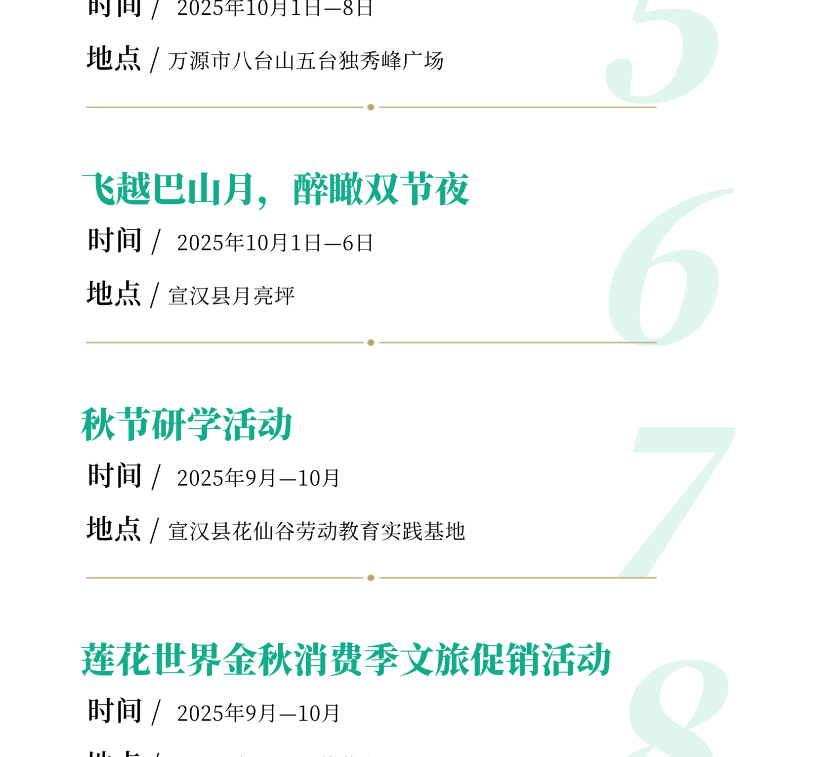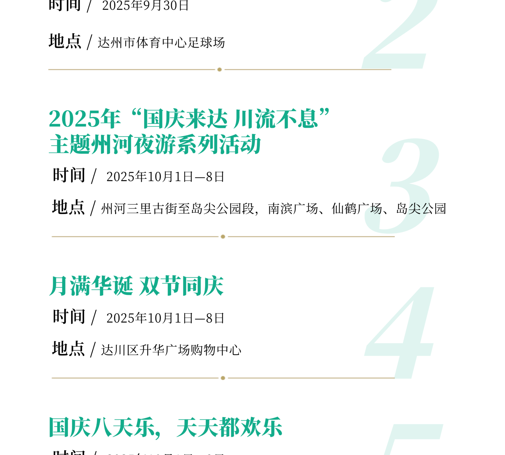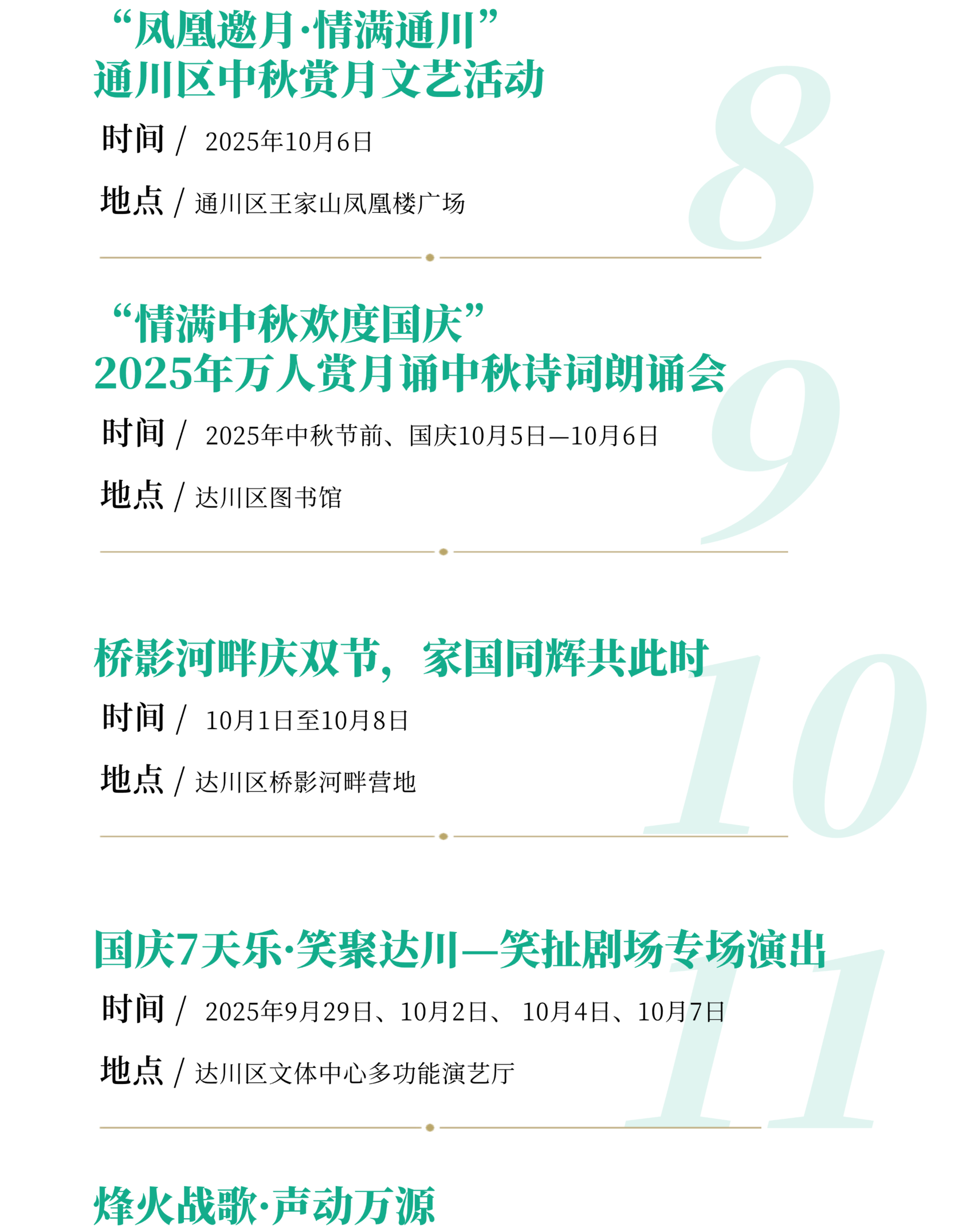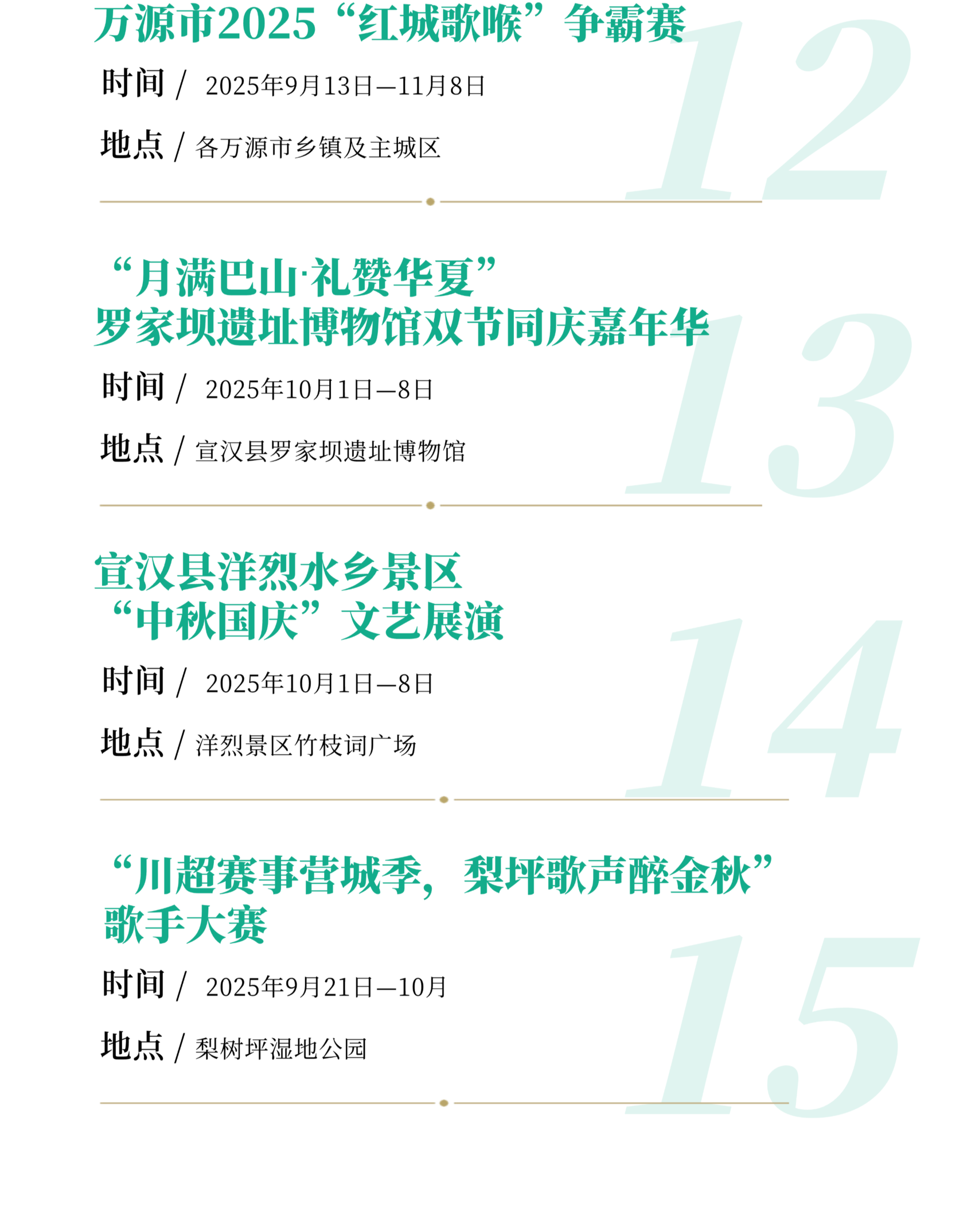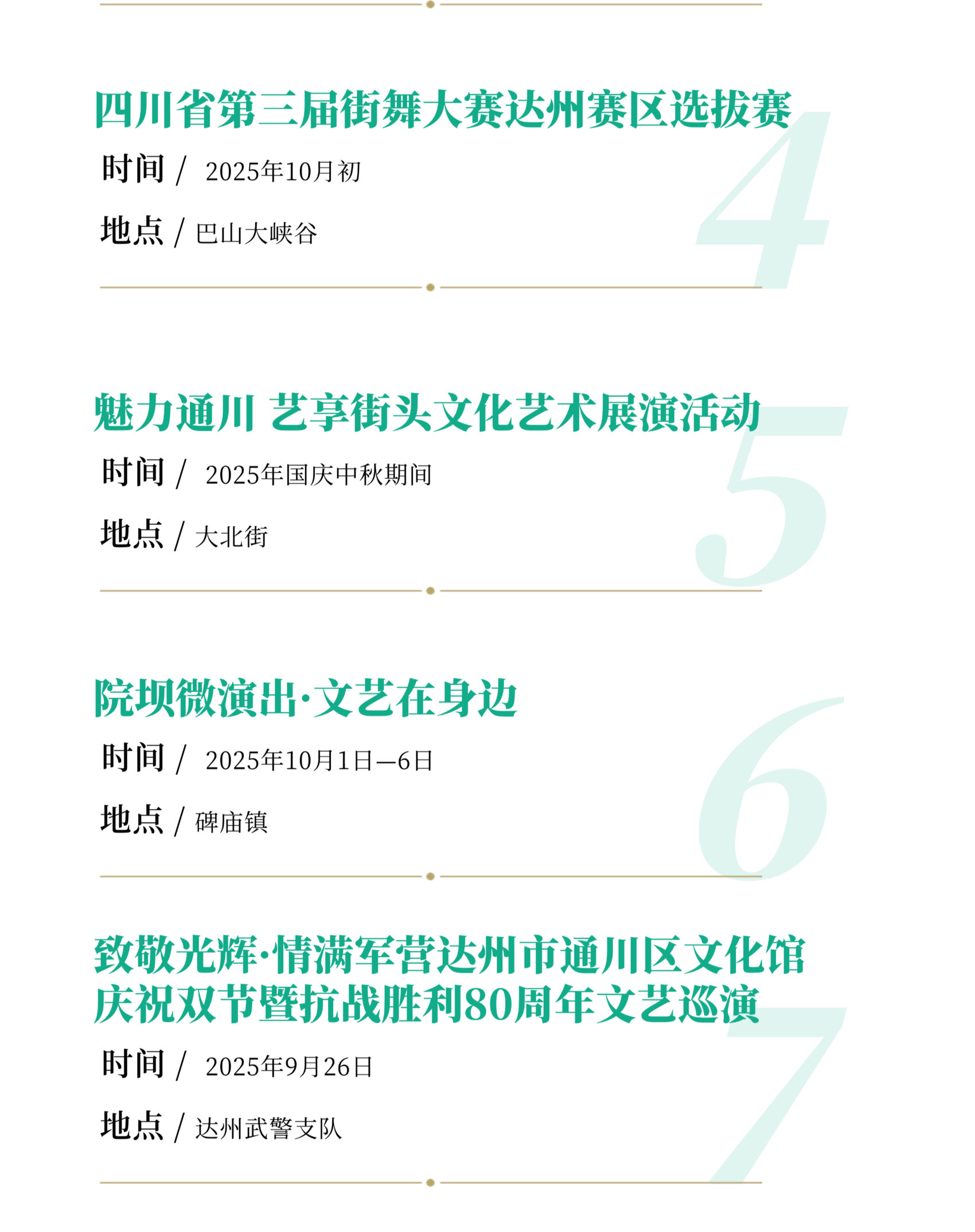 重点举行“唱着村歌游巴山”全市村歌展演、文化惠民进巴山大峡谷景区、“巴风賨韵•安逸达州” 2025年百姓大舞台达州市级展演、四川省第三届街舞大赛达州赛区选拔赛、“情满中秋欢度国庆”—2025年万人赏月诵中秋诗词朗诵会、“ 凤凰邀月·情满通川”通川区中秋赏月文艺活动、魅力通川·艺享街头文化艺术展演活动、院坝微演出•文艺在身边、致敬光辉•情满军营庆祝双节暨抗战胜利80周年文艺巡演、国庆7天乐·笑聚达川—笑扯剧场专场演出、三里古街•双节同庆嘉年华、桥影河畔庆双节、烽火战歌·声动万源—万源市2025“红城歌喉”争霸赛、“月满巴山·礼赞华夏”—罗家坝遗址博物馆双节同庆嘉年华、达州高新区“川超赛事营城季,梨坪歌声醉金秋” 歌手大赛等活动。
