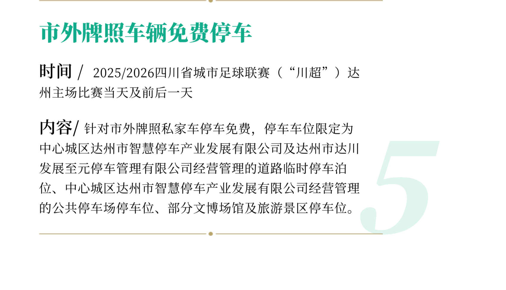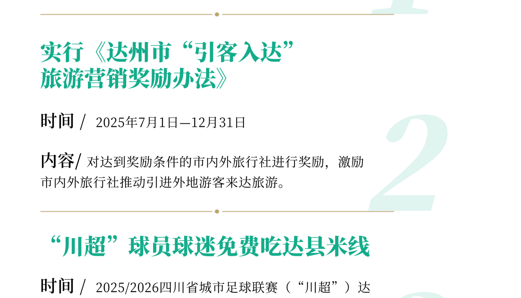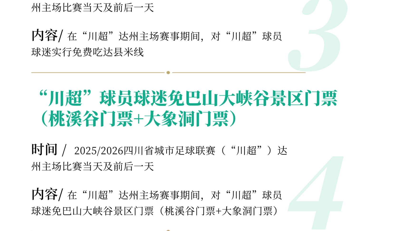 在“川超”达州主场赛事期间,对“川超”球员球迷实行免费吃达县米线、免巴山大峡谷景区门票(桃溪谷门票+大象洞门票),市外牌照车辆免费停车的“三免”福利,吸引外地游客来达观赛旅游。推出住宿餐饮优惠措施,根据赛事时间延长营业时间,策划一批“凭票折扣”“消费满减”等让利活动,设置球迷用餐专区,量身打造“球迷专属套餐”“延时退房”等优惠活动,联动周边餐饮、景点推出消费折扣。定向发放市本级文体旅游消费券支持巴山大峡谷景区套票、索道、演艺、滑雪等产品,助力巴山大峡谷创建国家5A级旅游景区。推出“川超”达州站比赛期间旅游景区优惠措施。实施“引客入达”旅游营销奖励办法,对符合条件的市内外组织市外游客来达旅游的旅行社、在市外宣传推广达州文旅资源产品的市内旅行社进行奖励。