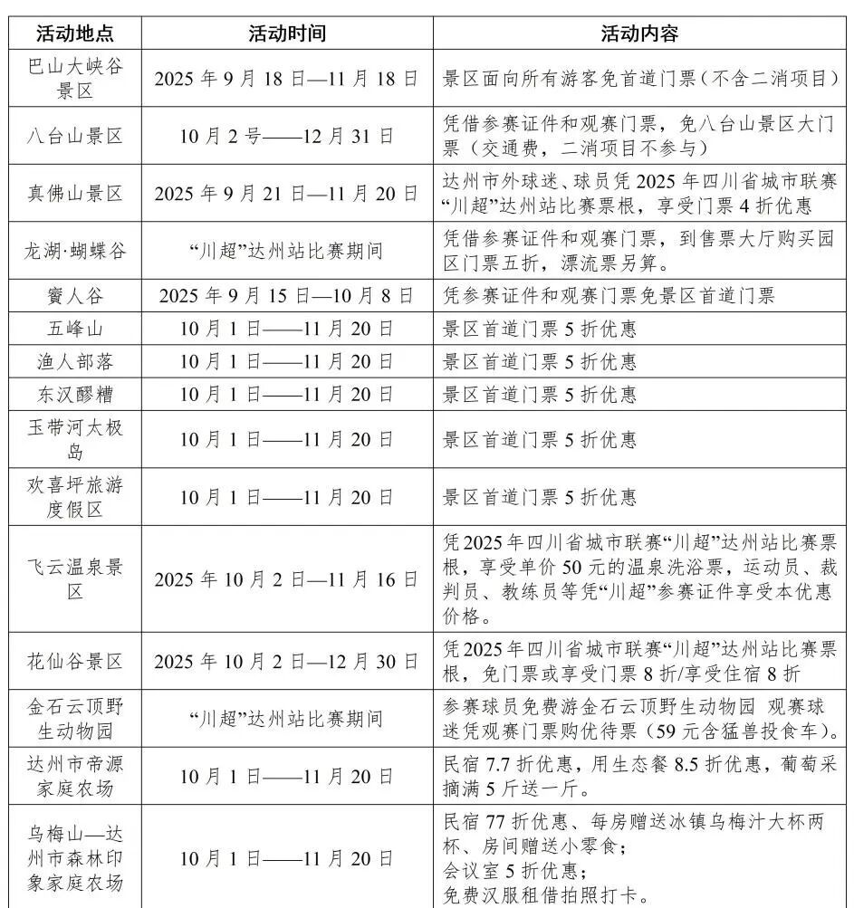 当国庆中秋双节遇上 “川超” 热血赛事这样的假期谁不爱?9月22日,达州市文化体育和旅游局传来众多好消息,9月至10月,达州以 “川超” 赛事为核心,推出系列特色活动和优惠措施,邀你共赴秋日文旅盛宴在巴山渠水间畅享欢乐。