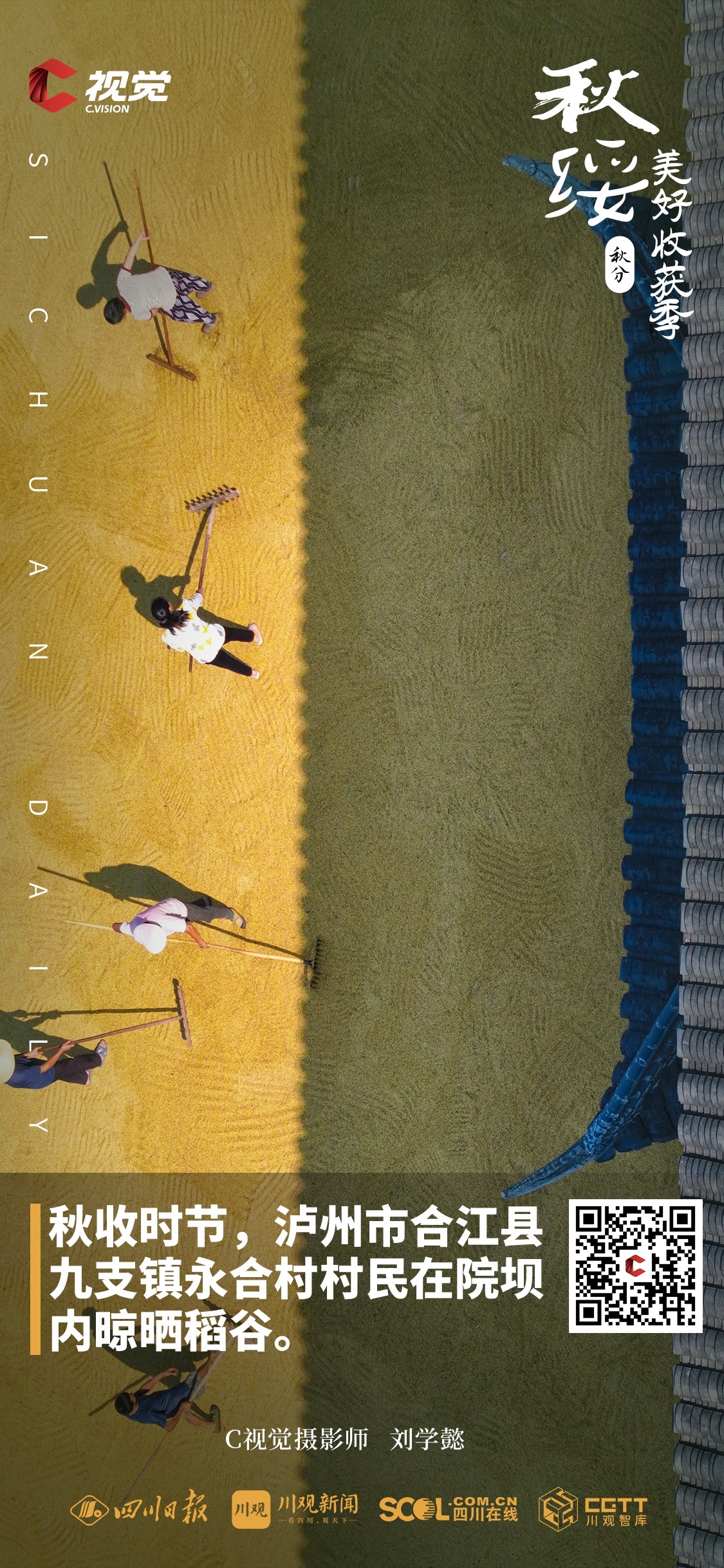 秋收时节,泸州市合江县九支镇永合村村民在院坝内晾晒稻谷。(C视觉签约摄影师 刘学懿 摄)
