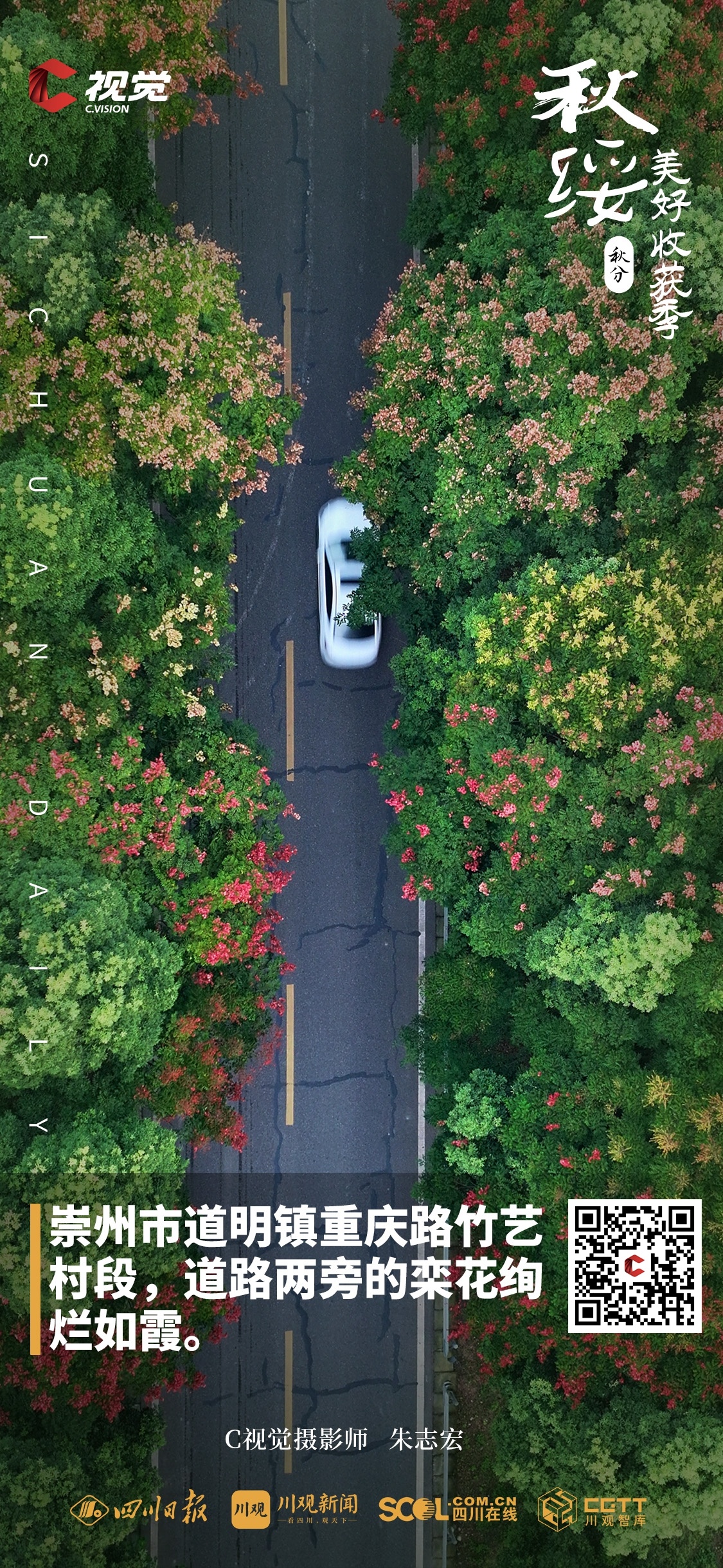 崇州市道明镇重庆路竹艺村段,道路两旁的栾花绚烂如霞。(C视觉签约摄影师 朱志宏 摄)