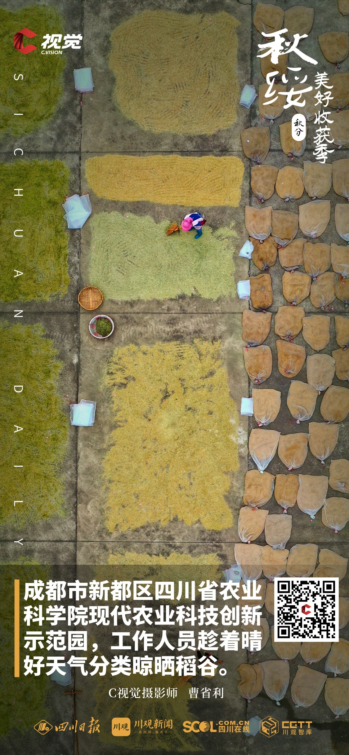 成都市新都区四川省农业科学院现代农业科技创新示范园,工作人员趁着晴好天气分类晾晒稻谷。(C视觉签约摄影师 曹省利 摄)