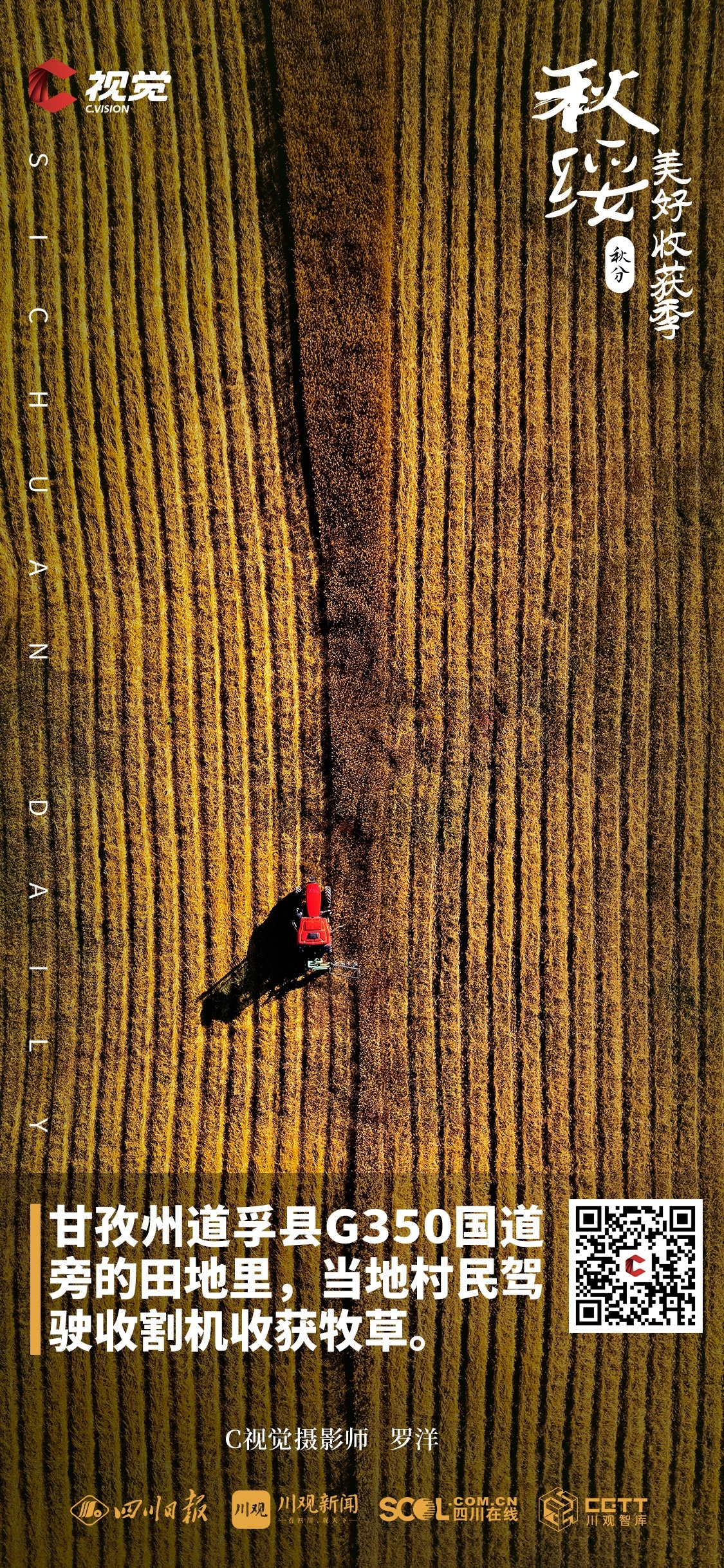 甘孜州道孚县G350国道旁的田地里,当地村民驾驶收割机收获牧草。(C视觉签约摄影师 罗洋 摄)