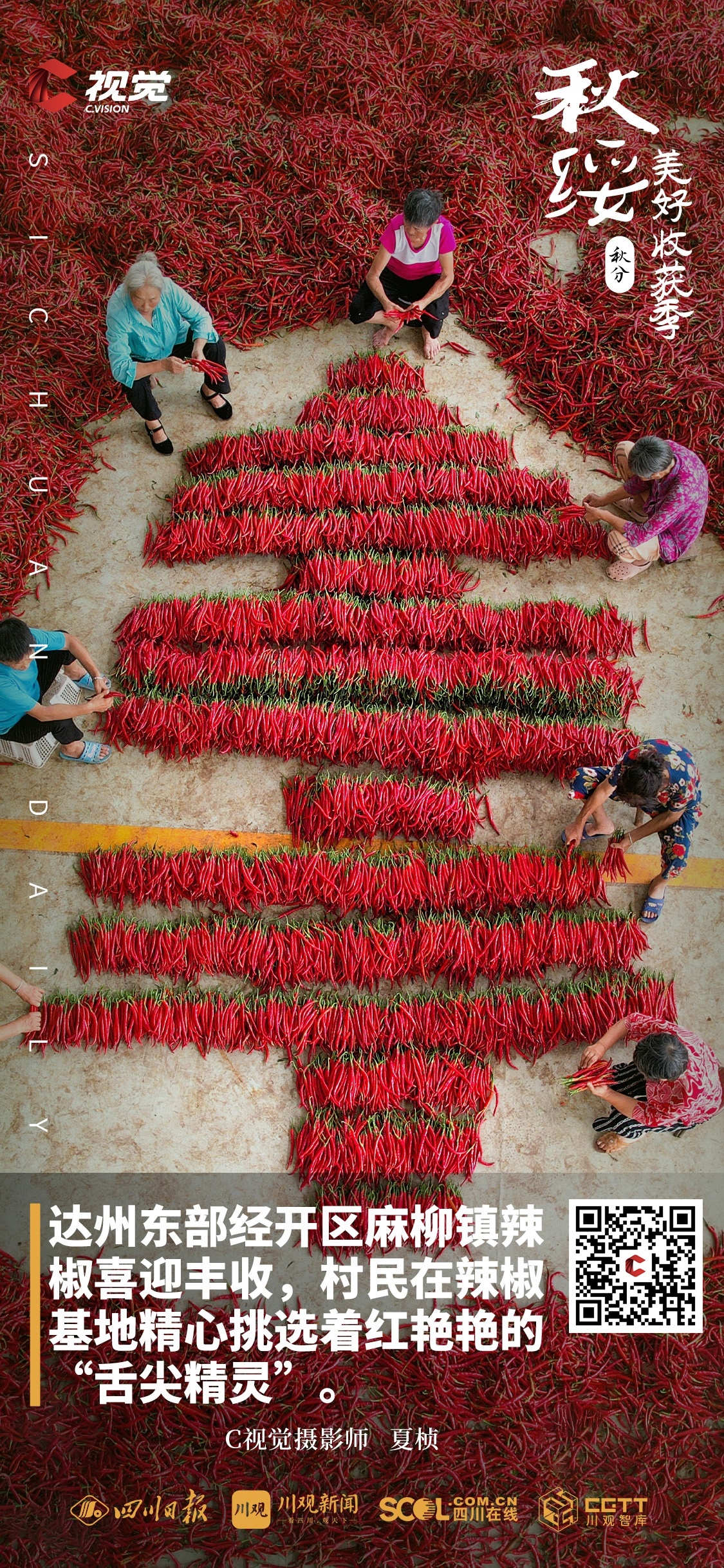 达州东部经开区麻柳镇辣椒喜迎丰收,村民在辣椒基地精心挑选着红艳艳的“舌尖精灵”。(C视觉签约摄影师 夏桢 摄)