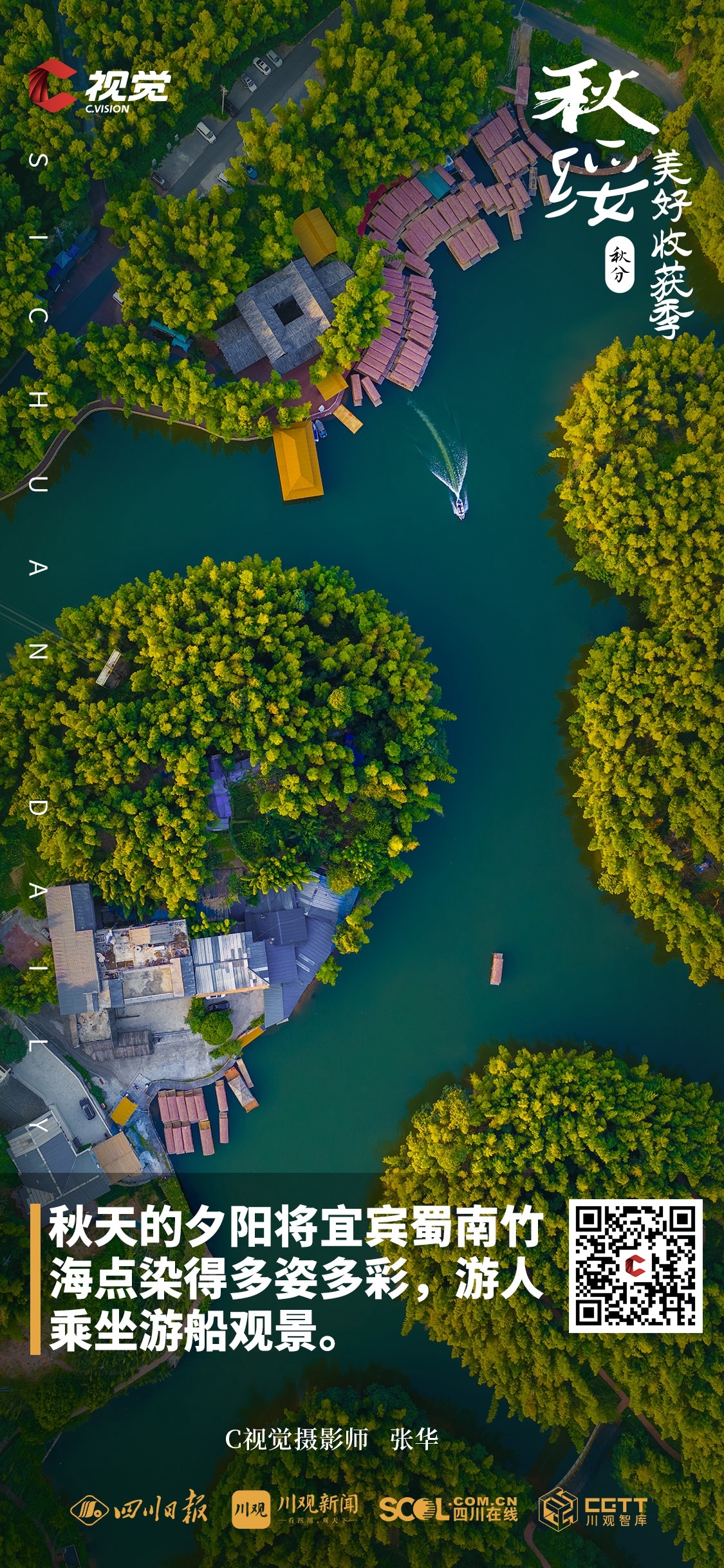 秋天的夕阳将宜宾蜀南竹海点染得多姿多彩,游人乘坐游船观景。(C视觉签约摄影师 张华 摄)