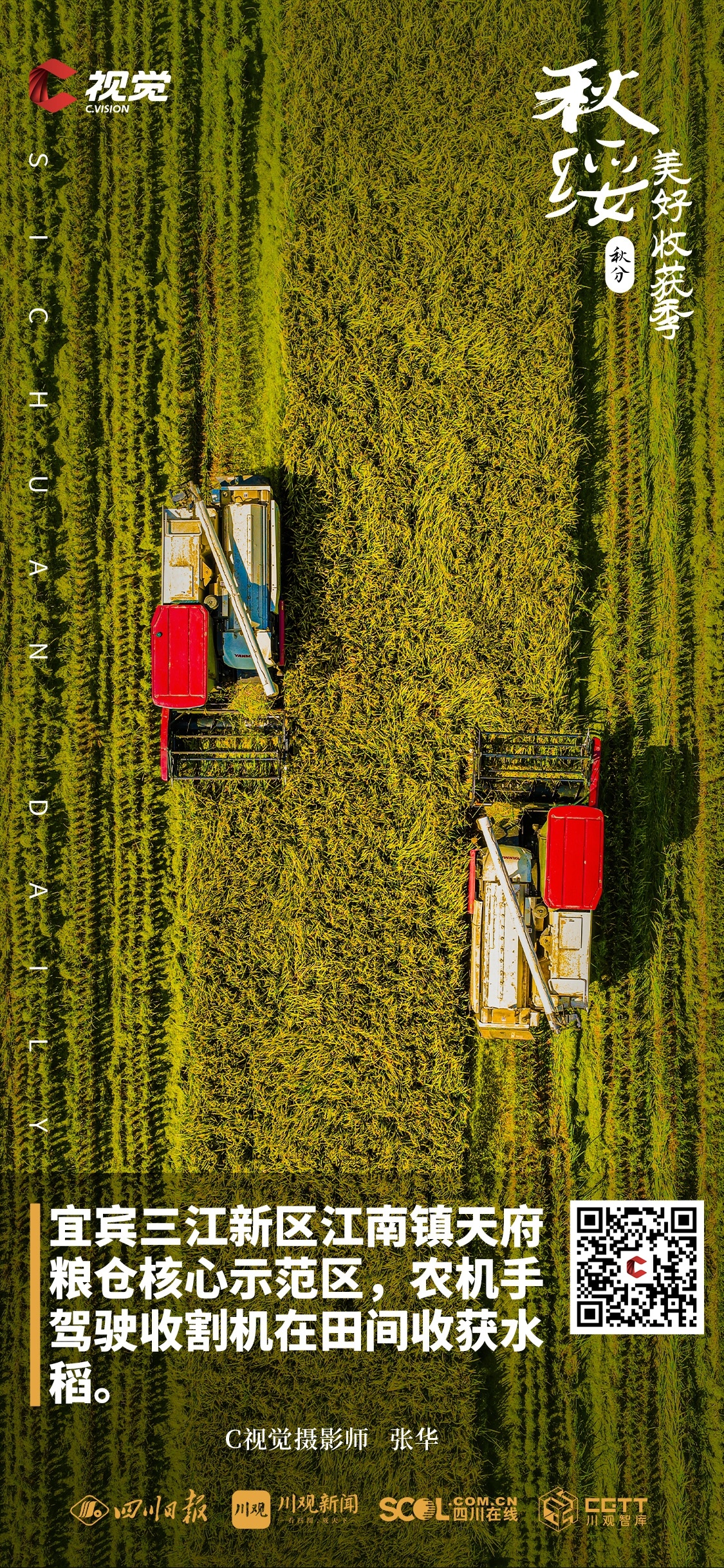 宜宾三江新区江南镇天府粮仓核心示范区,农机手驾驶收割机在田间收获水稻。(C视觉签约摄影师 张华 摄)