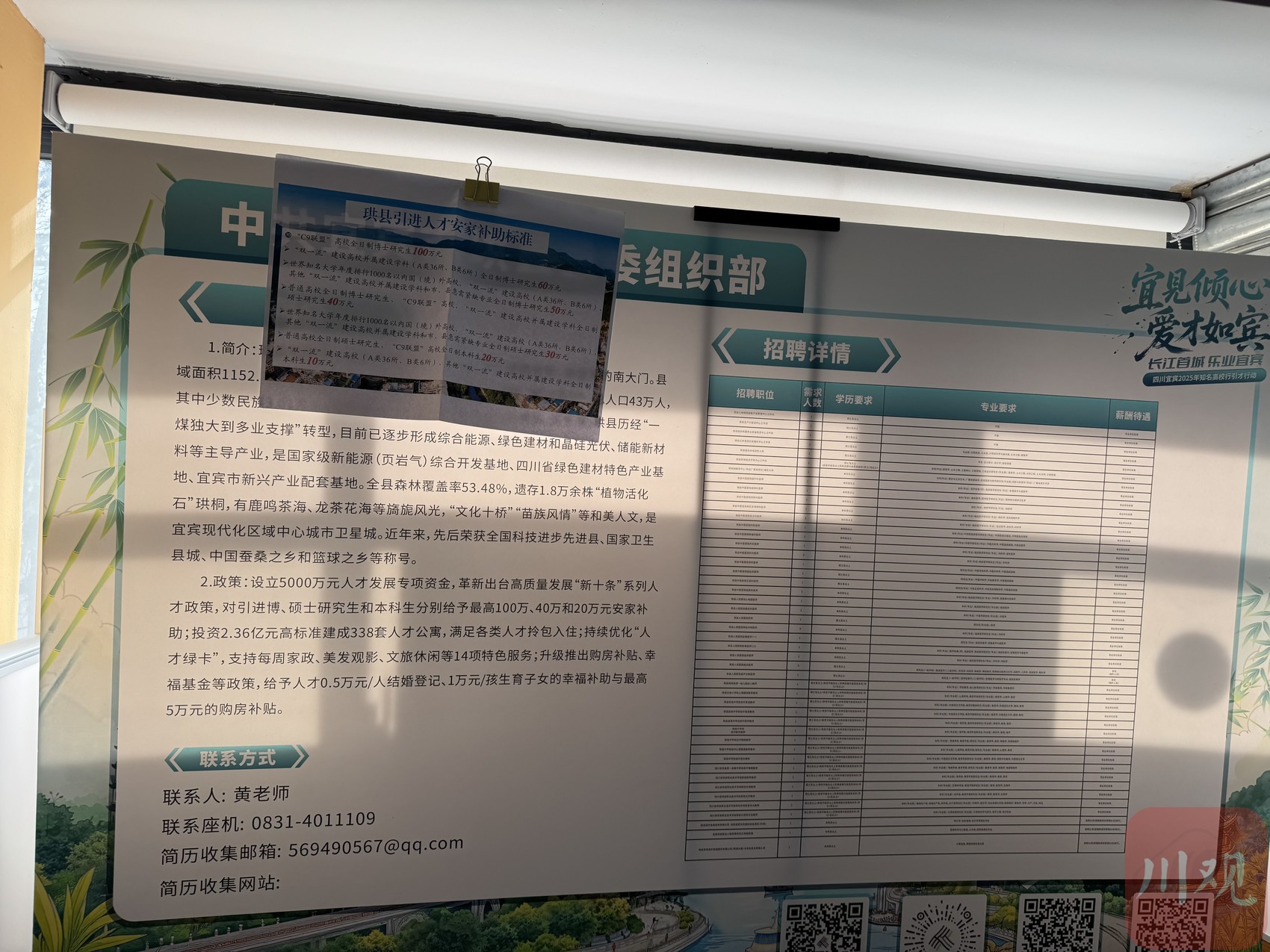 宜宾市珙县县委组织部的展区上,挂着一个“补丁”,介绍当地的引才政策。