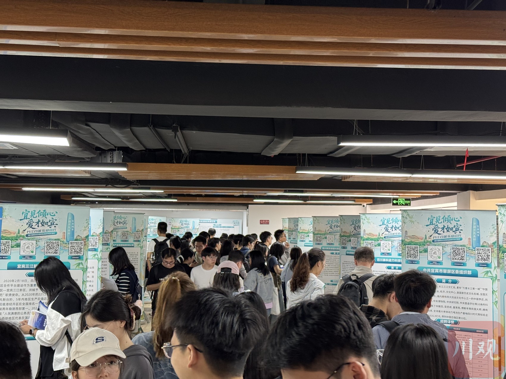 第三个特点是区县组织部门“批量带岗”。活动接近尾声,宜宾三江新区党群工作部的展位前仍然没有简历,展位负责人张浩指了指身边的易拉宝和展位上的二维码,这里有500多个岗位等待着同学们,只需要扫码就能和企业负责人说上话,不清楚的地方展位上也能一一解读。