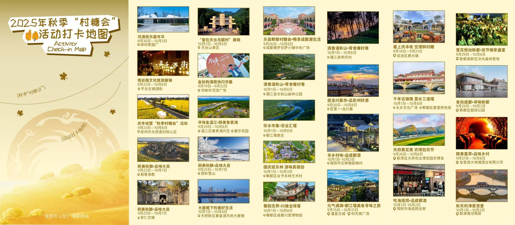 近期,成都市文化广电旅游局发布2025年秋季“村糖会”双主题地图——《2025年秋季“村糖会”地图》与《2025年秋季“村糖会”活动打卡地图》。地图串联起成都10余个区(市)县的特色活动,从9月下旬持续至10月,邀八方来客“寻新去处、享新体验、品新风味”,共酿成都乡村的浪漫记忆。