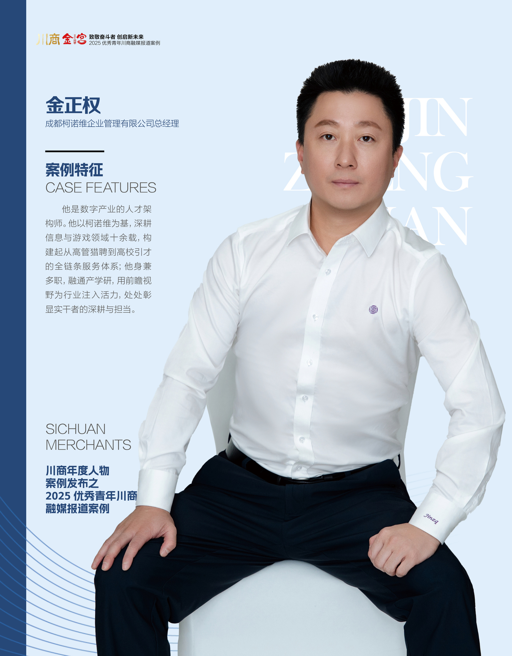 在成都这座充满活力与创新的城市,有一位深耕猎头行业14载的青年川商,他凭借对人才市场的敏锐洞察、对专业服务的极致追求,带领企业成为信息技术领域高端人才猎寻的坚守者,更以热忱之心投身公益、助力地方发展。他,就是成都柯诺维企业管理有限公司(以下简称“柯诺维猎头”)总经理金正权。近日,川商传媒专访金正权,探寻他与柯诺维猎头的成长之路,解码这位青年川商背后的责任与担当。