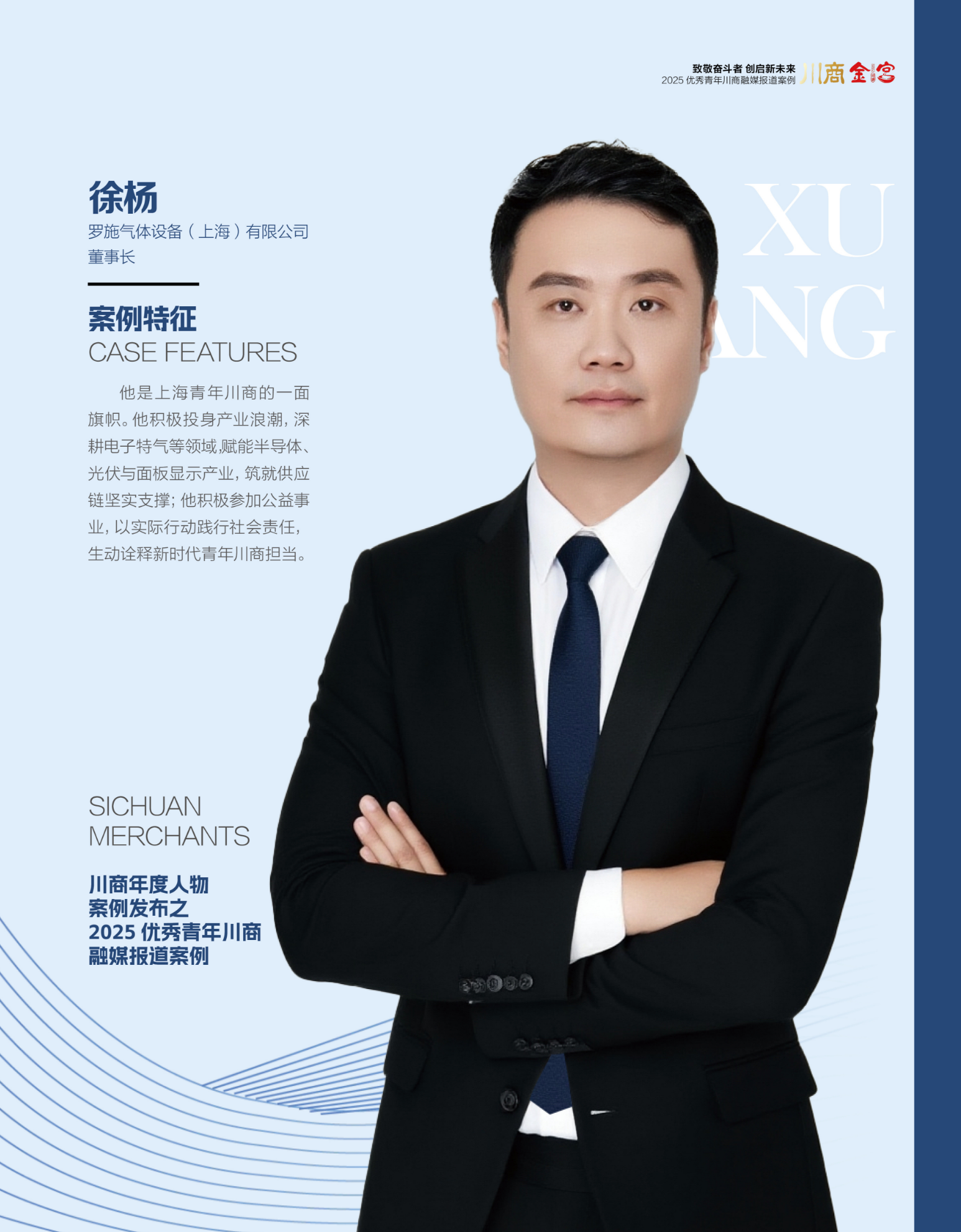 8月12日,以“致敬奋斗者 创启新未来”为主题的“川商年度人物案例发布之‘2025优秀青年川商融媒报道案例’发布活动”在成都举办。会上,四川日报报业集团川商传媒发布了“2025优秀青年川商融媒报道案例”入库名单。罗施气体设备(上海)有限公司董事长徐杨入选名单。