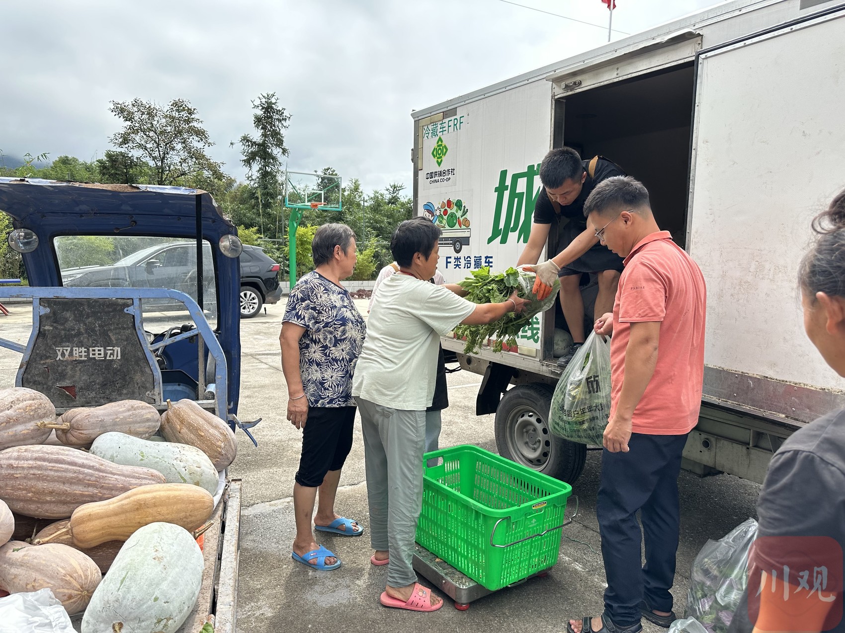 说话间,直通车来到了金鸡山村党群服务中心,村民们已经带着自家蔬菜在这里等候。三轮车、背篼里装着血皮菜、南瓜尖、红苕尖、老南瓜等新鲜蔬菜,品类丰富,菜叶上还带着露珠。