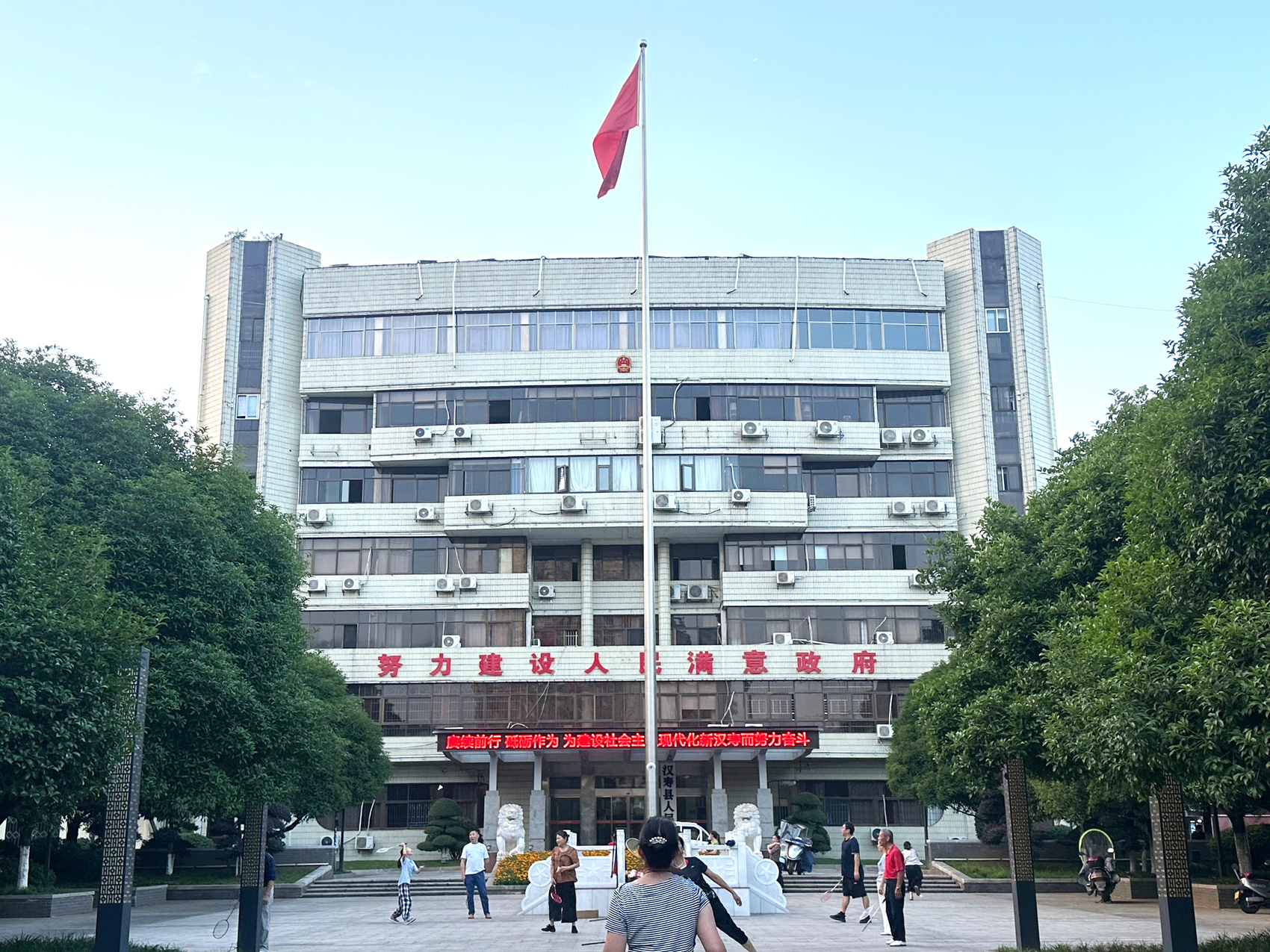 汉寿县政府大院前,当地居民正在打羽毛球、跳广场舞。(熊力/摄)
