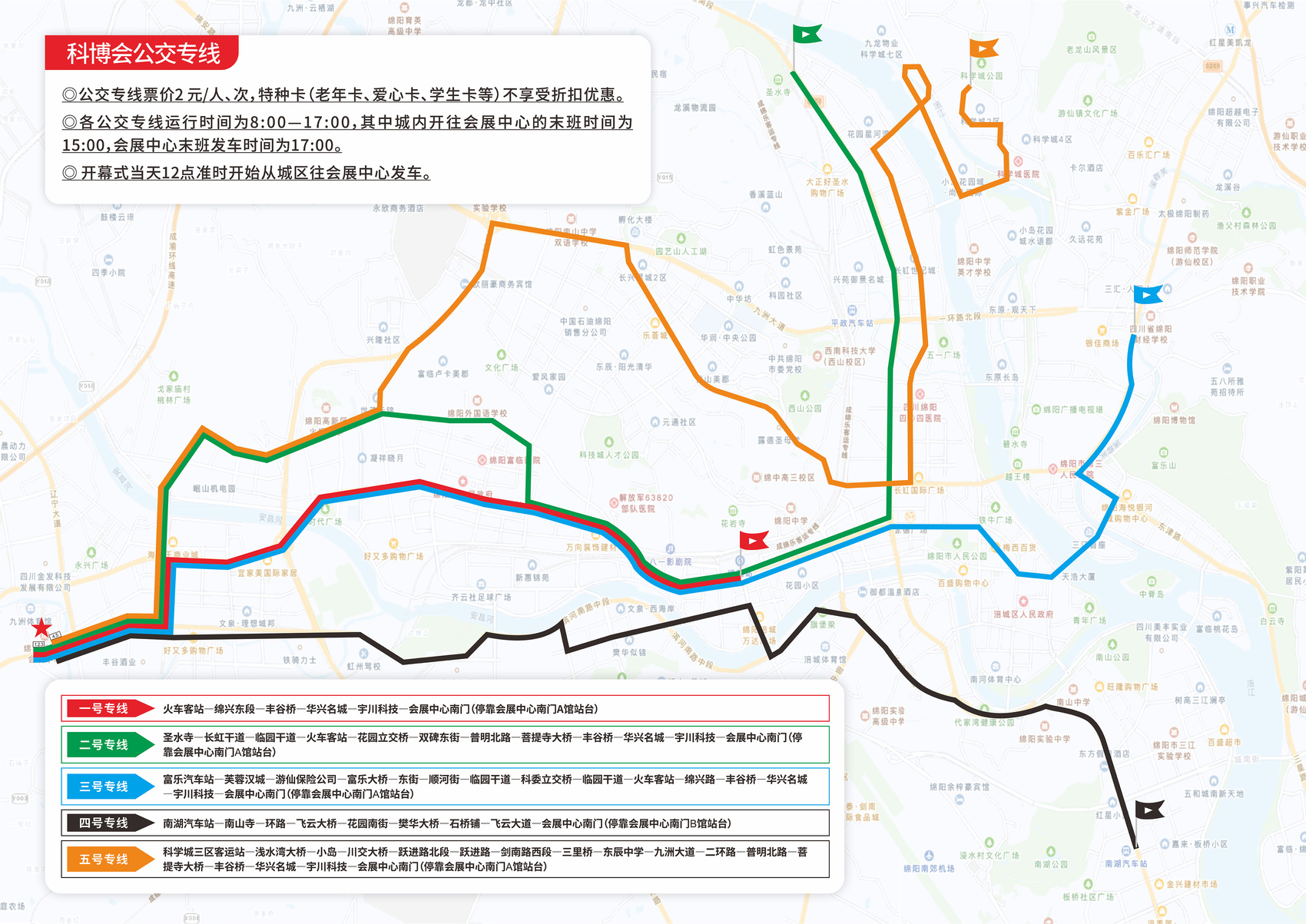 三号专线:富乐汽车站—芙蓉汉城—游仙保险公司—富乐大桥—东街—顺河街—临园干道—科委立交桥—临园干道—火车客站—绵兴路—丰谷桥—华兴名城—宇川科技—会展中心南门;停靠会展中心南门A馆站台。