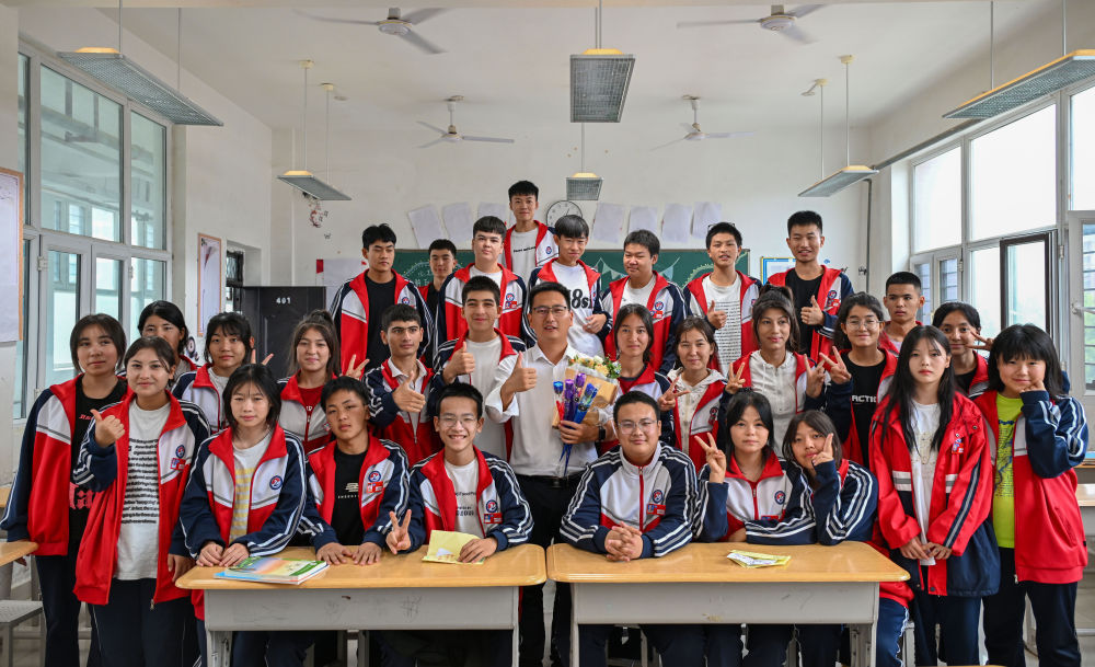 2024年9月10日,在新疆阿拉尔职业技术学校,援疆教师李斌傲(中)和23级电商班的学生合影。“95后”年轻教师李斌傲是第十一批浙江台州到新疆阿拉尔职业技术学校援疆教师中的一员,负责教授电子商务专业课程。他在学校主导筹建了电商实训室,还带了4个新入职的教师当徒弟。“培训好本地教师,就是打造一支带不走的队伍。”李斌傲说。
