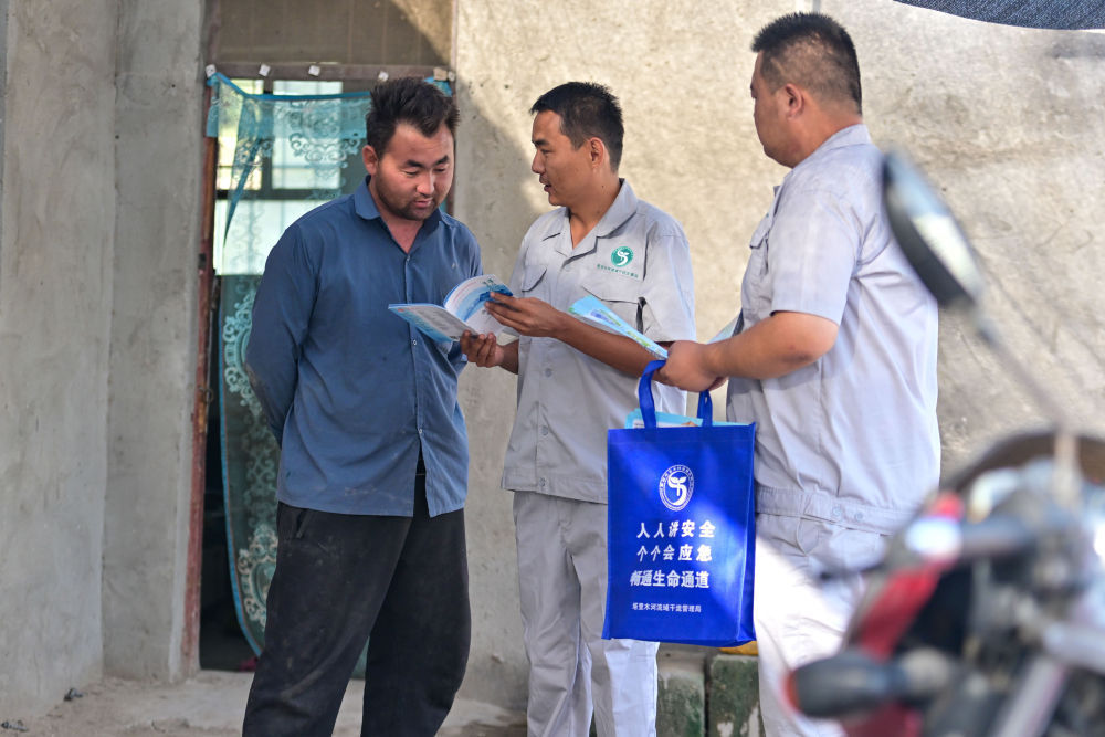 2024年8月13日,在新疆塔里木河尉犁段,新疆塔里木河流域干流管理局乌斯满管理站副站长才登巴(中)与同事宋志伟入户宣传法律法规。