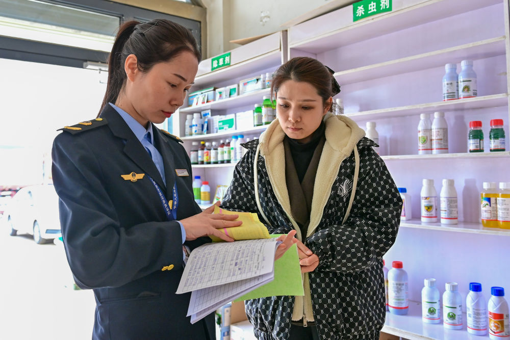 2024年3月21日,新疆阿克苏市农业综合行政执法大队的执法人员在阿克苏市农资市场查看农资经销部的销售台账。
