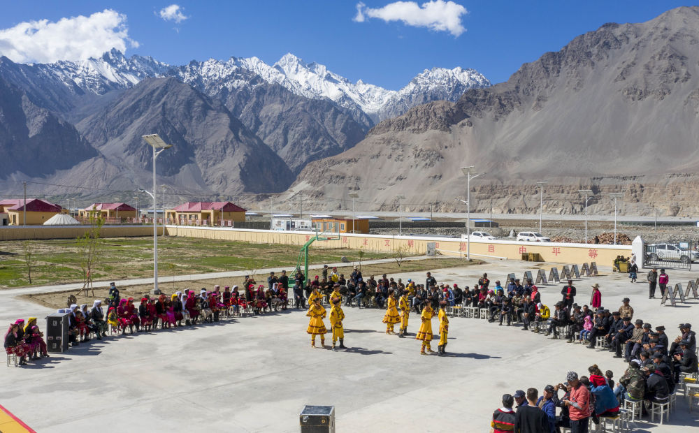 2020年6月6日,新疆塔什库尔干塔吉克自治县文工团演员在达布达尔乡的一个山村为村民表演舞蹈节目(无人机照片)。塔县文工团成立于1956年,现有工作人员100余人,是活跃于新疆帕米尔高原上的“文艺轻骑兵”。在自然环境严酷的高原,塔县文工团演员们常年坚持送文化进山村、到牧场,宣讲惠民政策,用文艺演出丰富村民的精神文化生活。