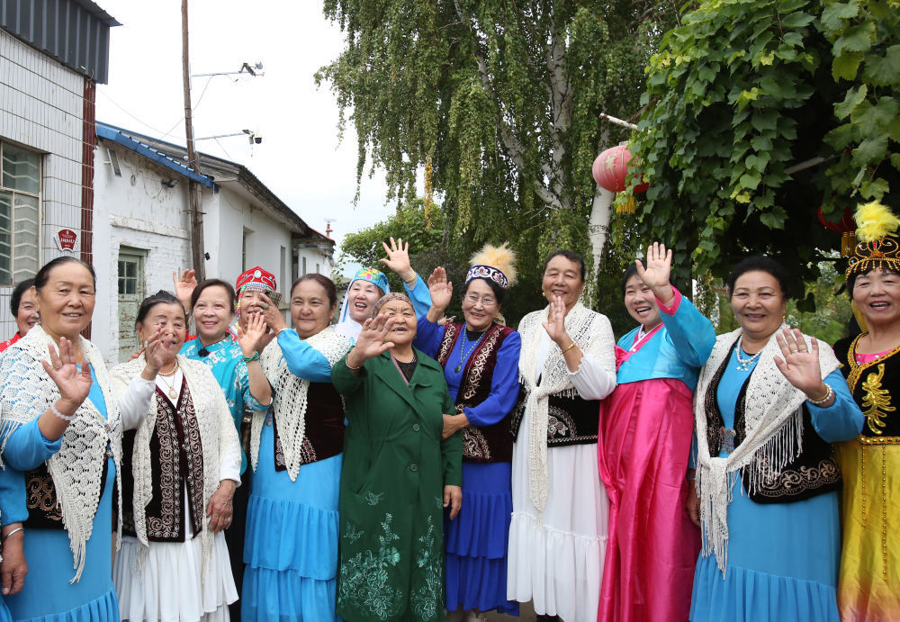 2025年9月9日,新疆阿勒泰地区阿勒泰市红墩镇的老人在“户儿家”文化大院合影,该镇居民由汉族、哈萨克族、维吾尔族、蒙古族等11个民族组成。“户儿家”源于清末,是哈萨克族对甘肃、山西、陕西等省迁居红墩镇的40户汉族居民的称呼。100多年来,“户儿家”几代人与各族群众相互融合、共同发展,成为各民族相互交融的典范。