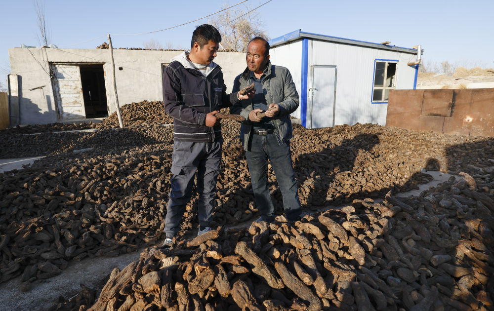 2024年12月4日,新疆民丰县尼雅镇甫甫克村村民麦麦提(右)同前来收购大芸的商户交流。自20世纪末新疆全面开展防风治沙工程并大力推进沙产业以来,麦麦提从在合作社挖大芸赚工钱,到后来主动学习大芸种植技术并创业,一路走来小有收获。2018年,他承包了10亩沙地种红柳、大芸。红柳茁壮成长,大芸产量颇丰,麦麦提年收入超过5万元。
