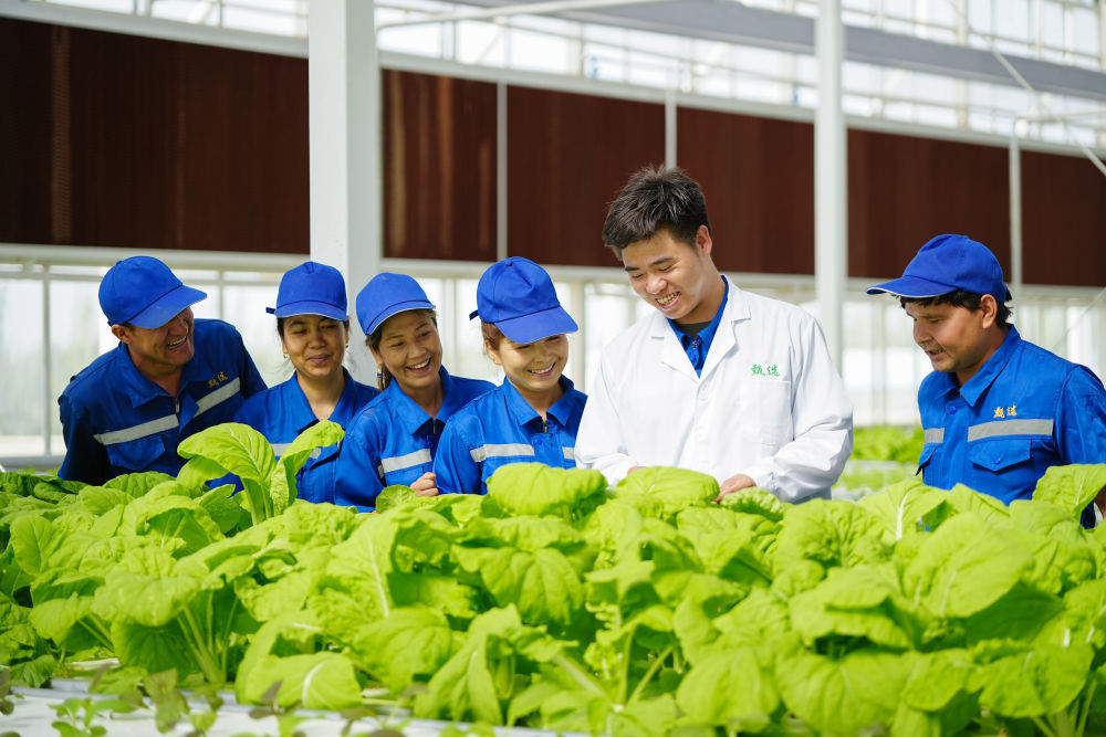 2025年6月25日,在新疆阿克苏地区库车市甬库同心村智慧农业植物工厂,技术人员在培训当地的农业产业工人。该工厂是浙江省宁波市对口援疆项目之一,引入了宁波企业先进的无土栽培技术和设备,通过智能调控成功种植多种原本不适宜在当地生存的农作物。该项目在帮助村民在家门口实现就业的同时,还为当地培养了农业产业工人,同时为周边学校开展农业科技科普提供了便利,实现经济效益与社会效益“双丰收”。