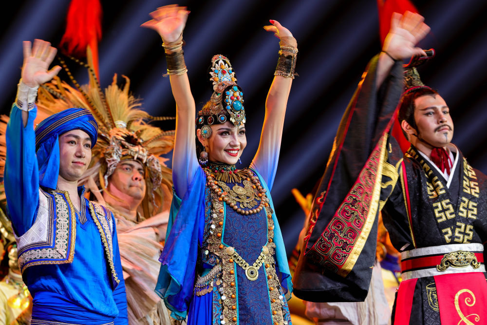 2022年4月22日,在新疆艺术剧院木卡姆艺术团剧场,舞蹈演员马依热·艾买提江(中)在舞剧《张骞》演出后向观众致谢。马依热来自乌鲁木齐,11岁时前往北京跟随专业舞蹈老师学习,学成后回到家乡,成为新疆艺术剧院歌舞团的一名舞蹈演员。“新疆的歌舞是中华传统文化的一部分,是用来歌颂美好生活的。希望我的舞蹈,能增进各民族间的感情,促进文化交融。”马依热说。