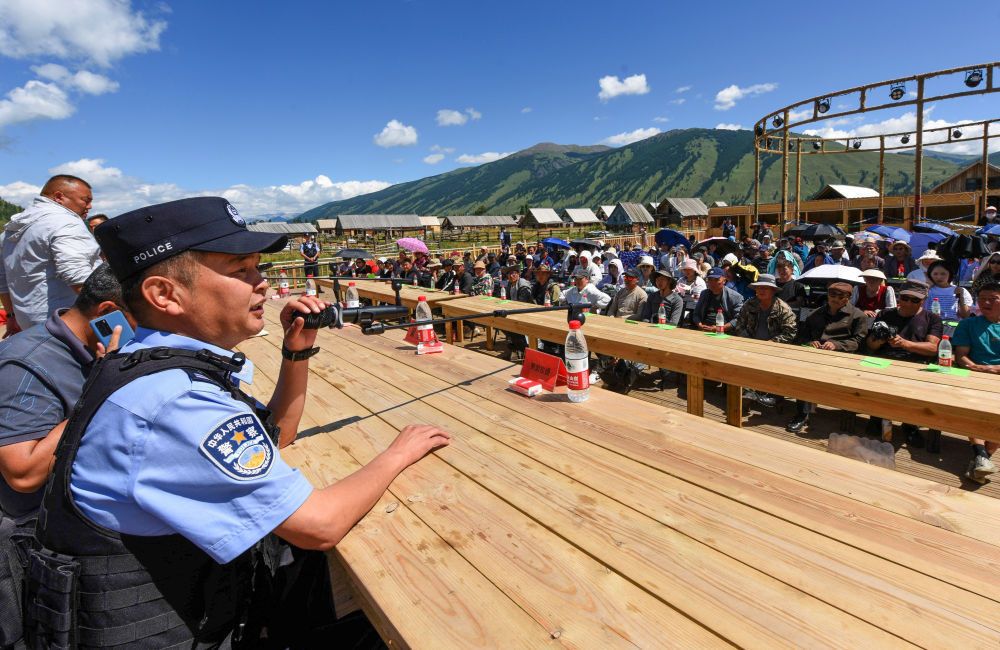 2024年7月22日,在新疆阿勒泰地区布尔津县禾木哈纳斯蒙古族乡哈纳斯村,喀纳斯边境派出所民警在村民大会上给村民宣讲边境法律法规。近年来,喀纳斯边境派出所通过“警村企党支部联合工作站”模式,联合当地群众、景区一起解决游客难题,大大提升了警务效率,逐步形成了“景中警 贴心人”的旅游警务品牌。