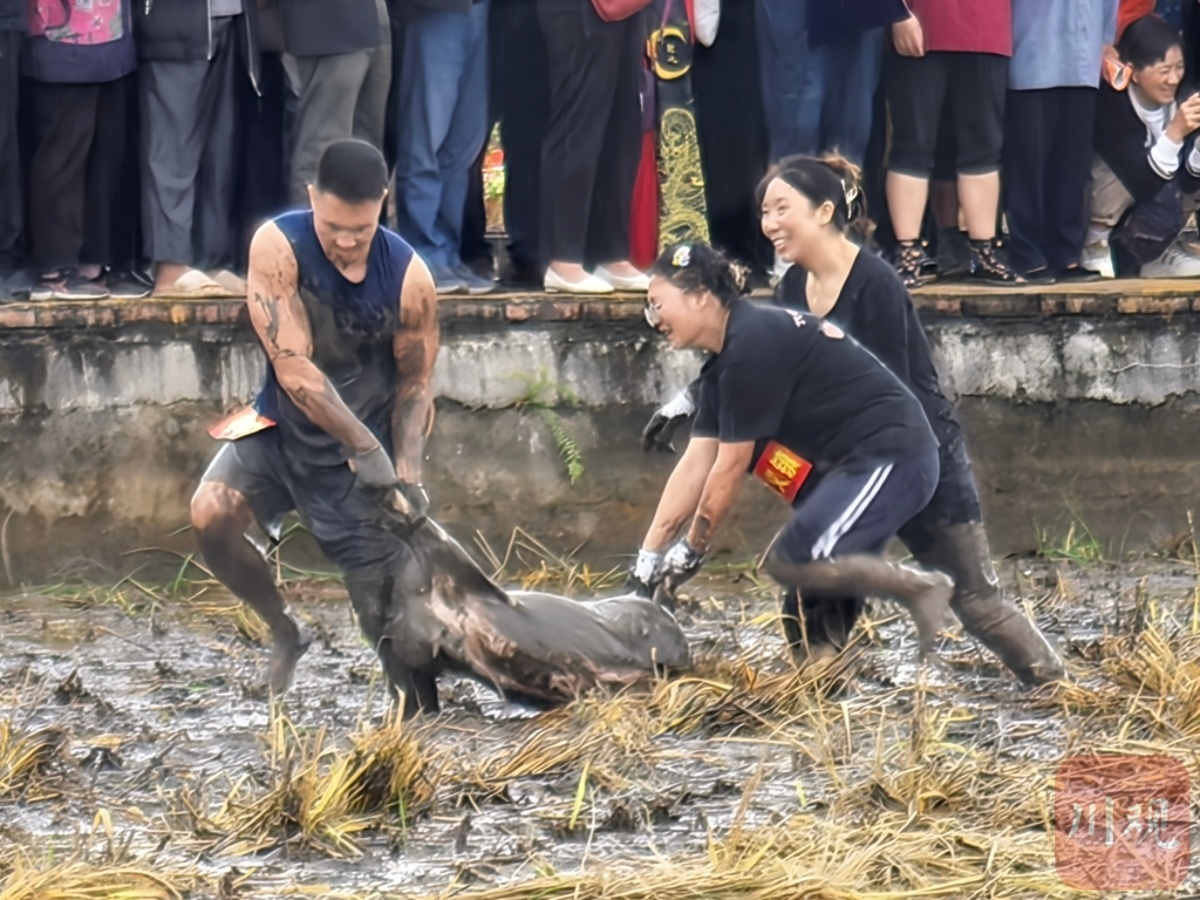 比赛现场气氛热烈,欢呼声、助威声、欢笑声不绝于耳。金黄的稻田映衬着选手们忙碌的身影,铿锵的号子与比赛的哨声奏响丰收的旋律。无论是拔河时的全力协作、打谷子时的汗水挥洒,还是投玉米的精准一掷、剥玉米的飞快手法,抑或是秧田抓鱼的机敏灵活、徒手逮猪的妙趣横生,每个项目都生动演绎着农耕劳动的智慧与汗水,传递出质朴浓郁的乡土情怀和丰收喜悦。