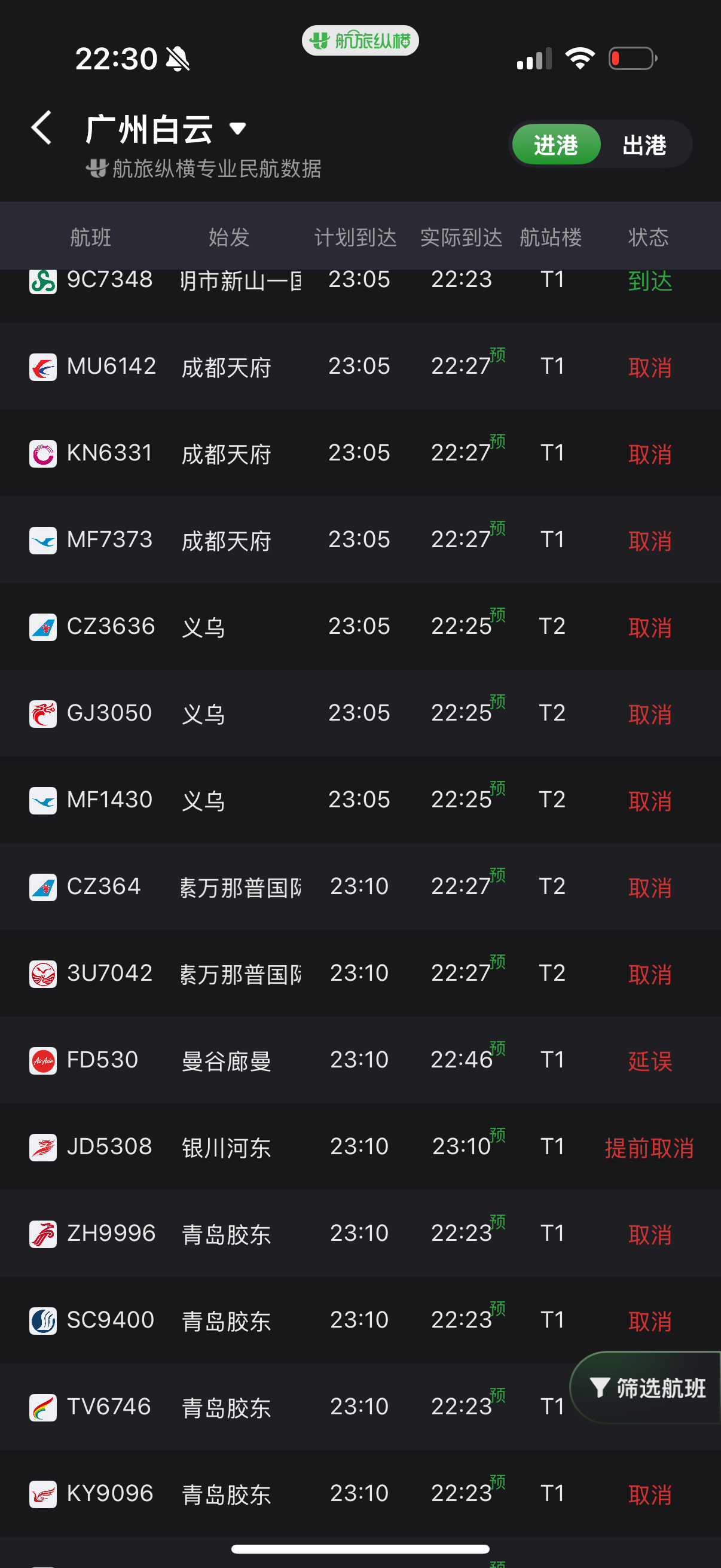 9月23日晚,23点后的广州白云机场进港航班大面积取消 图片来源:航旅纵横App