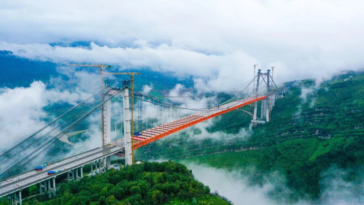 ▷23日,贵州安顺—盘州高速公路天门特大桥顺利实现合龙,建成后将成为世界第三高桥及全球最高双向六车道钢桁梁悬索桥。