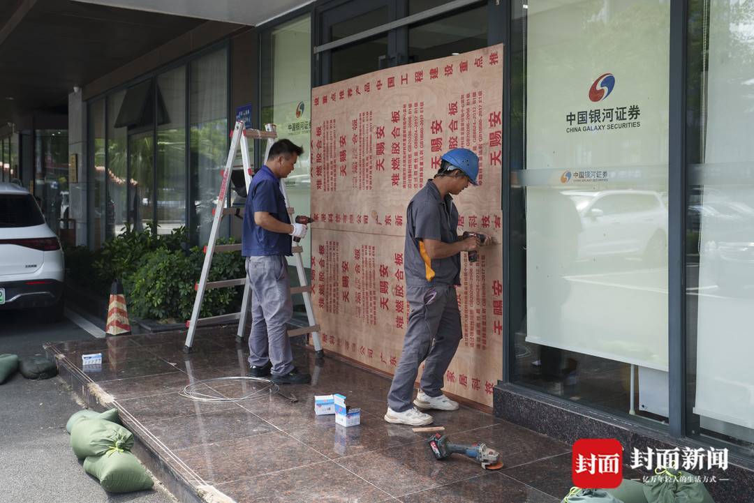 9月23日上午,珠海香洲区的一家银行,工作人员加固落地玻璃。