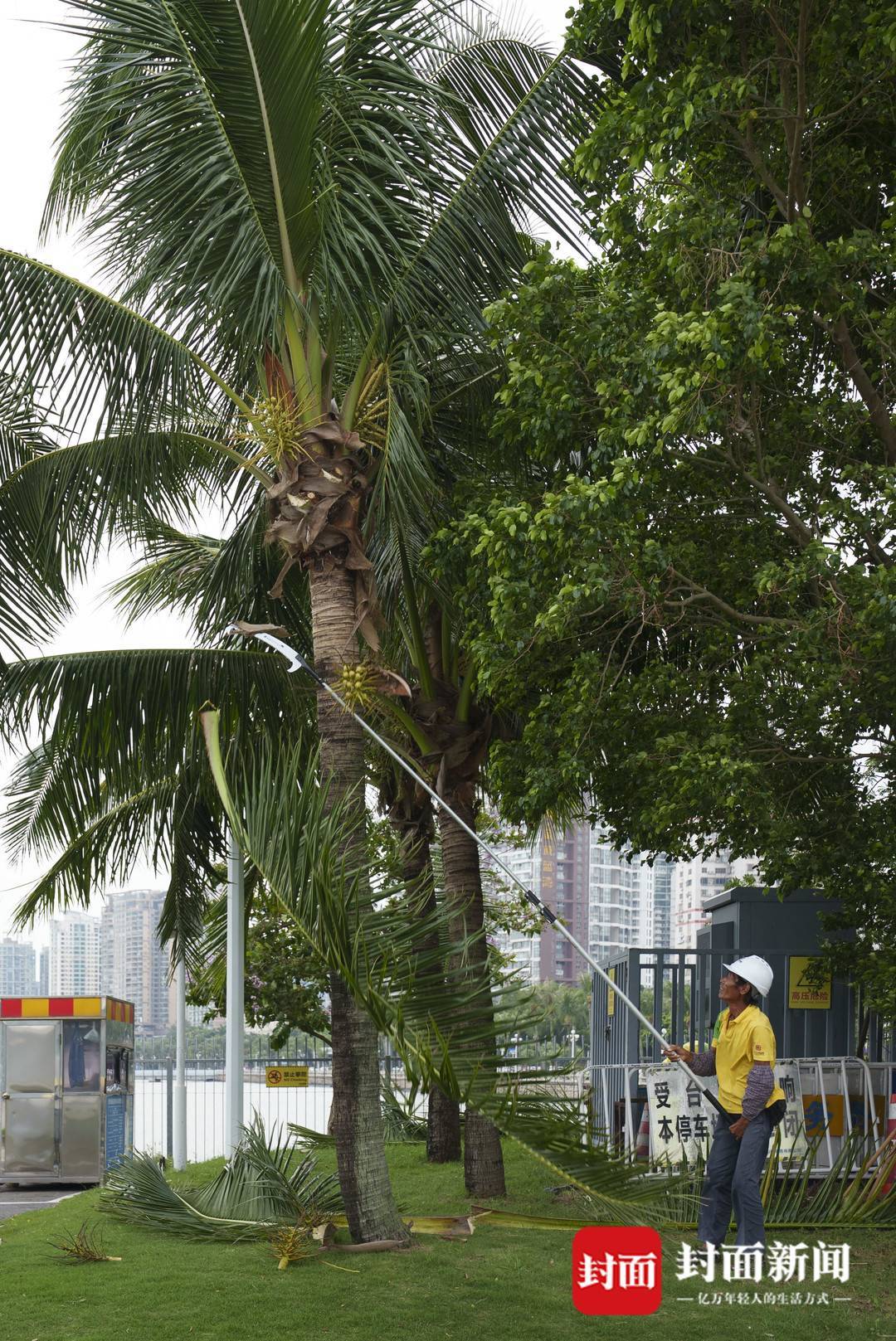 9月23日,珠海香洲港客运码头旁,为防台风条掉落砸到行人车辆,工作人员提前清理椰子树上的树叶和椰子。